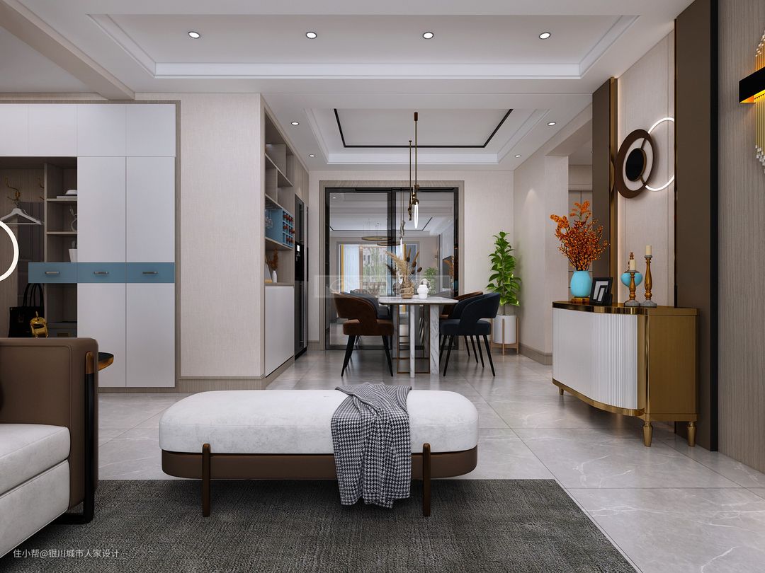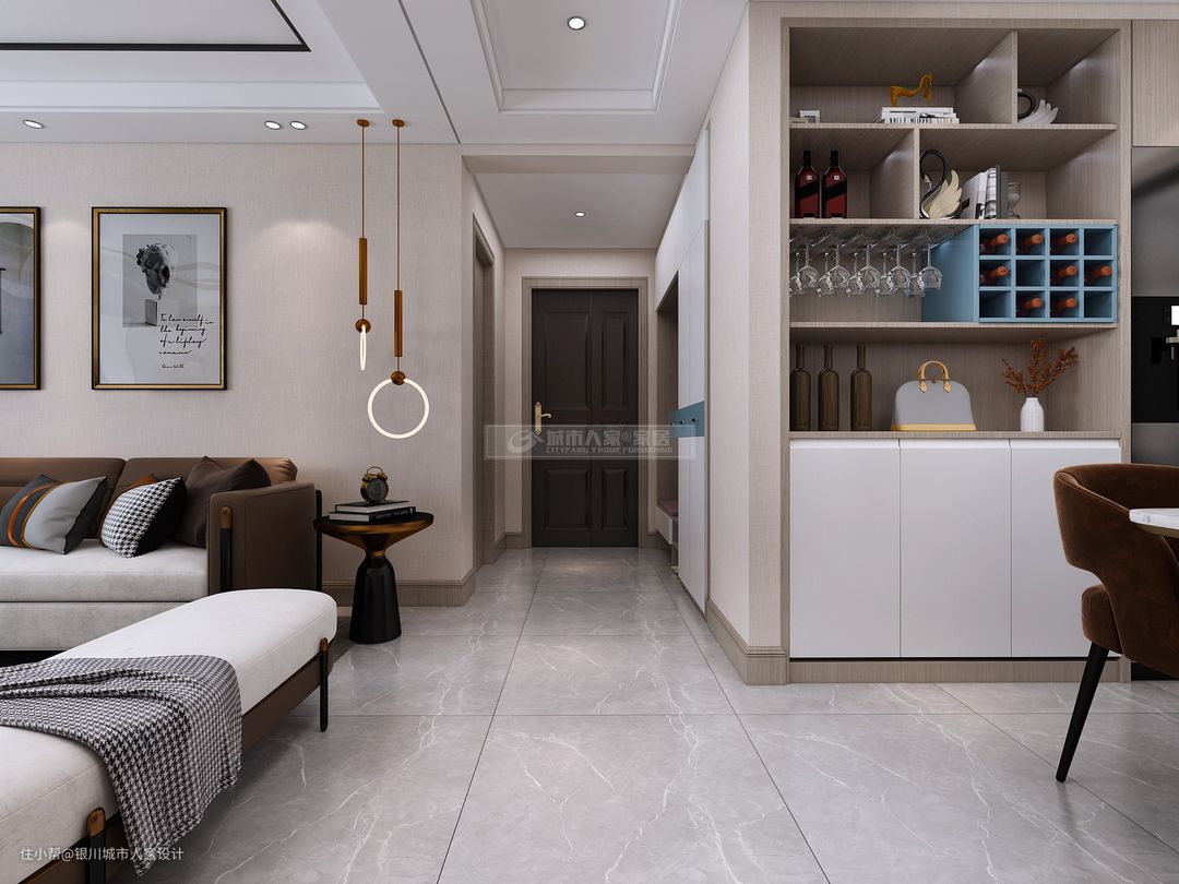 入户左手边便是餐厅,嵌入式的餐边柜可以用来收纳和展示,既美观又实用。