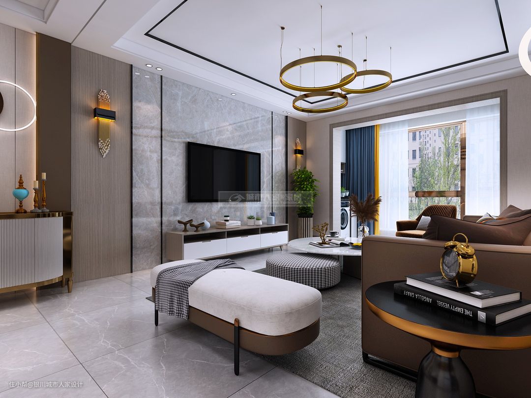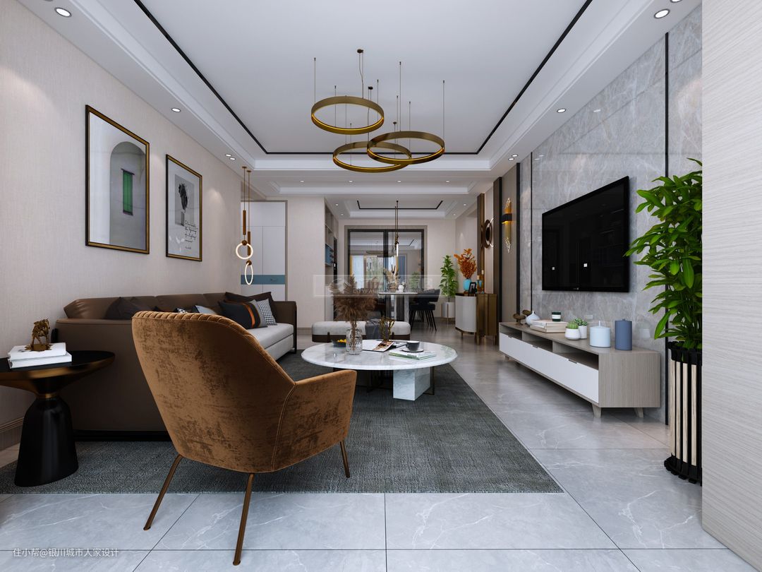 棕色与白色拼接的绒布沙发,还有大理石台面的茶几,结合精致儒雅的细节软饰布置,营造出一种低调但高级的空间氛围。