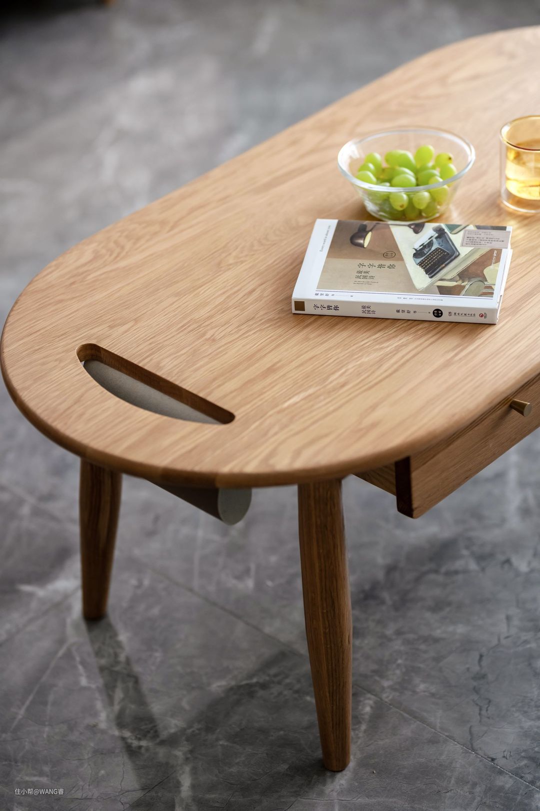 弧形的茶几为木头的材质,增加了柔和度,其高脚腿的设计,也让空间显得通透些.