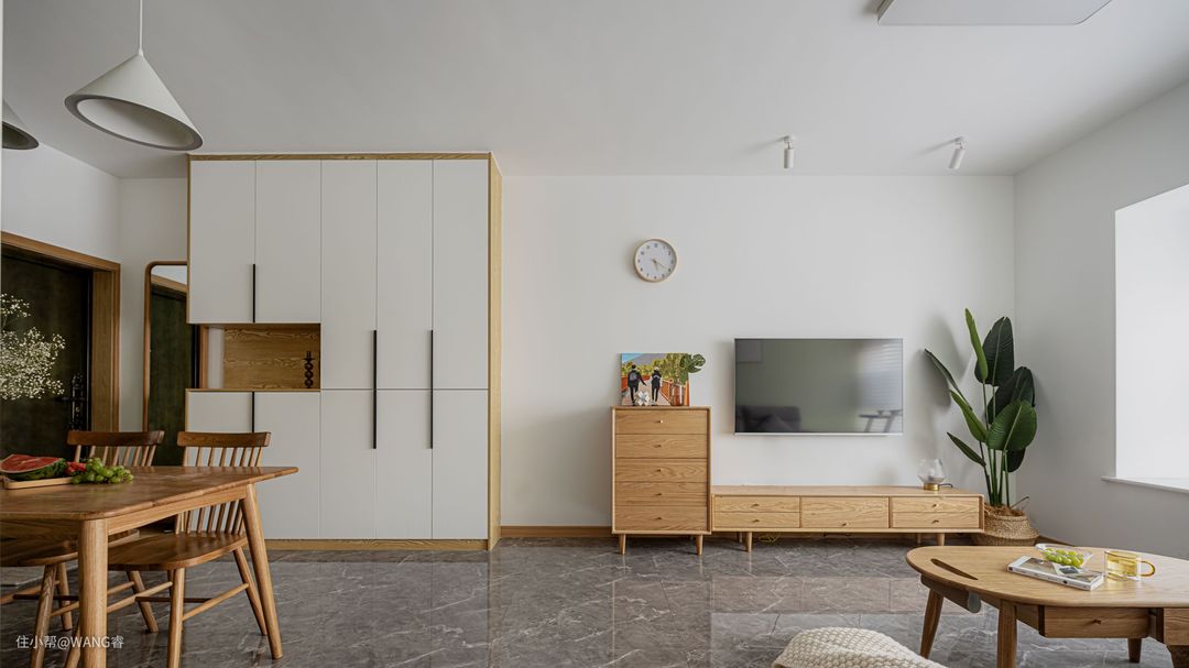 经过人物动线模拟,在进门处设置穿衣镜以及换鞋凳区域.靠镜子的鞋柜做了上下柜处理,将中间部分留出,一是考虑避出进门的视线拥堵感,二是方便进门后钥匙的放置;其次平时的纸巾等需要堆放,所以顺着鞋柜做了一体的储物柜空间.