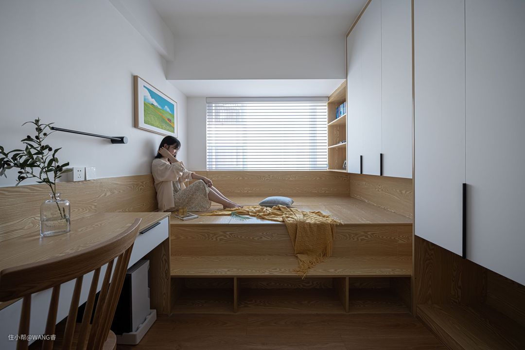 原有飘窗不能拆除.利用其位置向内扩出1.5米宽床的区域,而延伸位置下方有一定高度.遂作为储物区考虑.而挑空的踏步为空间增加细节层次,也在视觉上增加了延伸感.