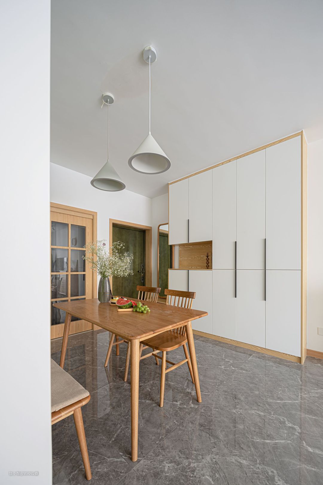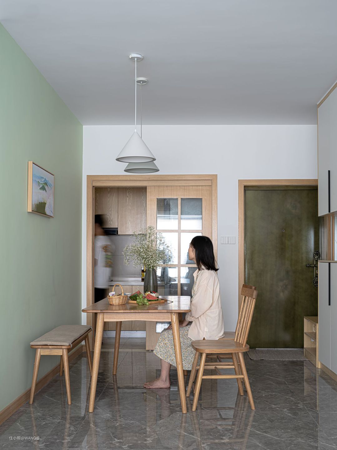 原有的厨房门扩大改成双推.增加厨房的采光.也避出餐厅旁到顶柜子会产生的压抑感.让空间更通透.