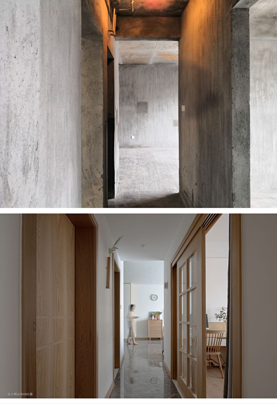 推拉门出来的墙上做了小装饰,避出迎面即墙的拥堵感,同时营造入眼即景的氛围.公卫的干湿分区处理,满足了同时淋浴或者洗手功能.