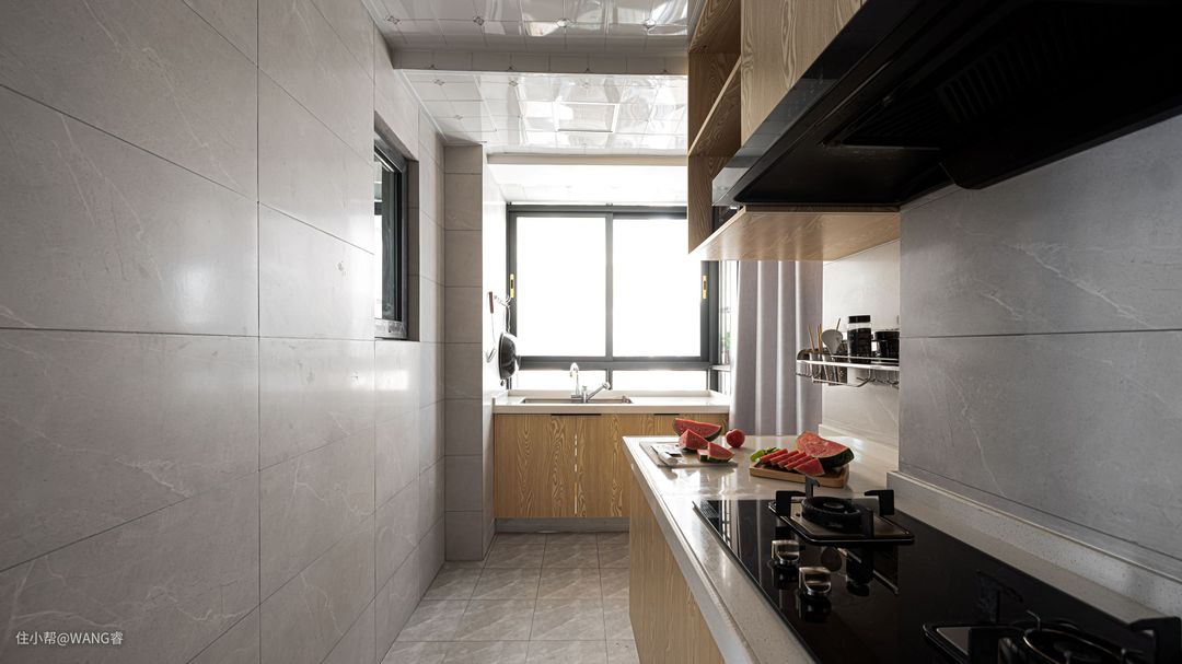 女业主的位置,原有是墙体,将其拆除后,改善了厨房光线,同时扩大了空间,顺着拐角的位置.延伸了台面的宽度.多了一个备菜区域.
