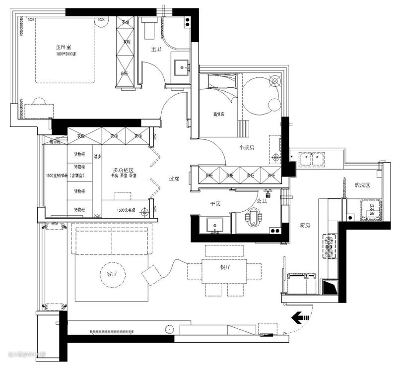 1-将多功能房的墙打掉,新建墙体换上玻璃门,将光线引入过道. 2-改变小孩房的门洞,方便其内部布局,同时为过道增加细节.