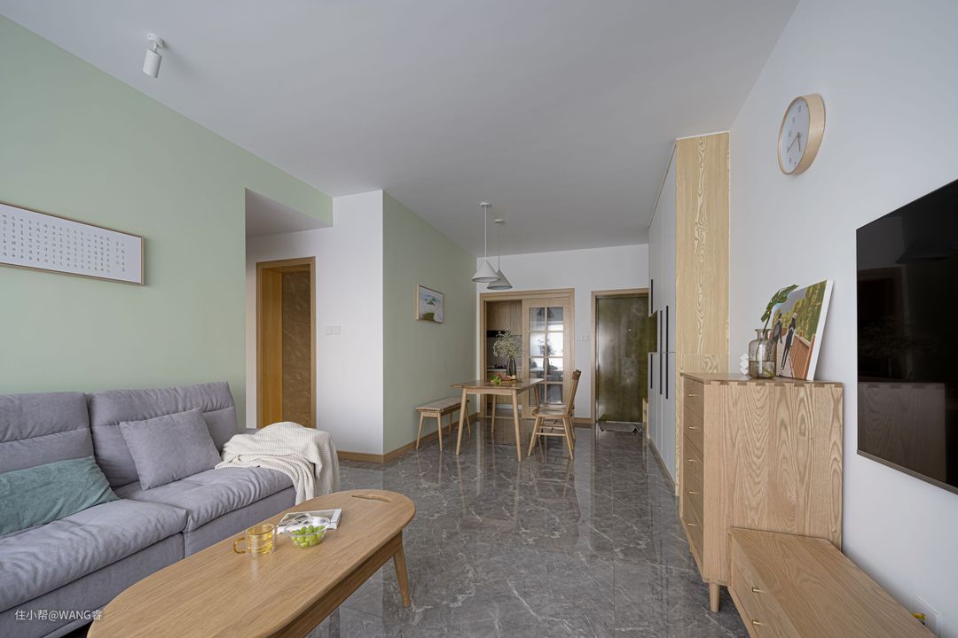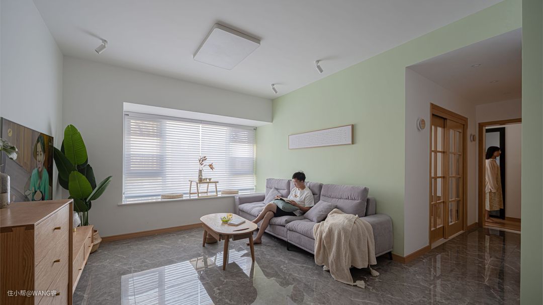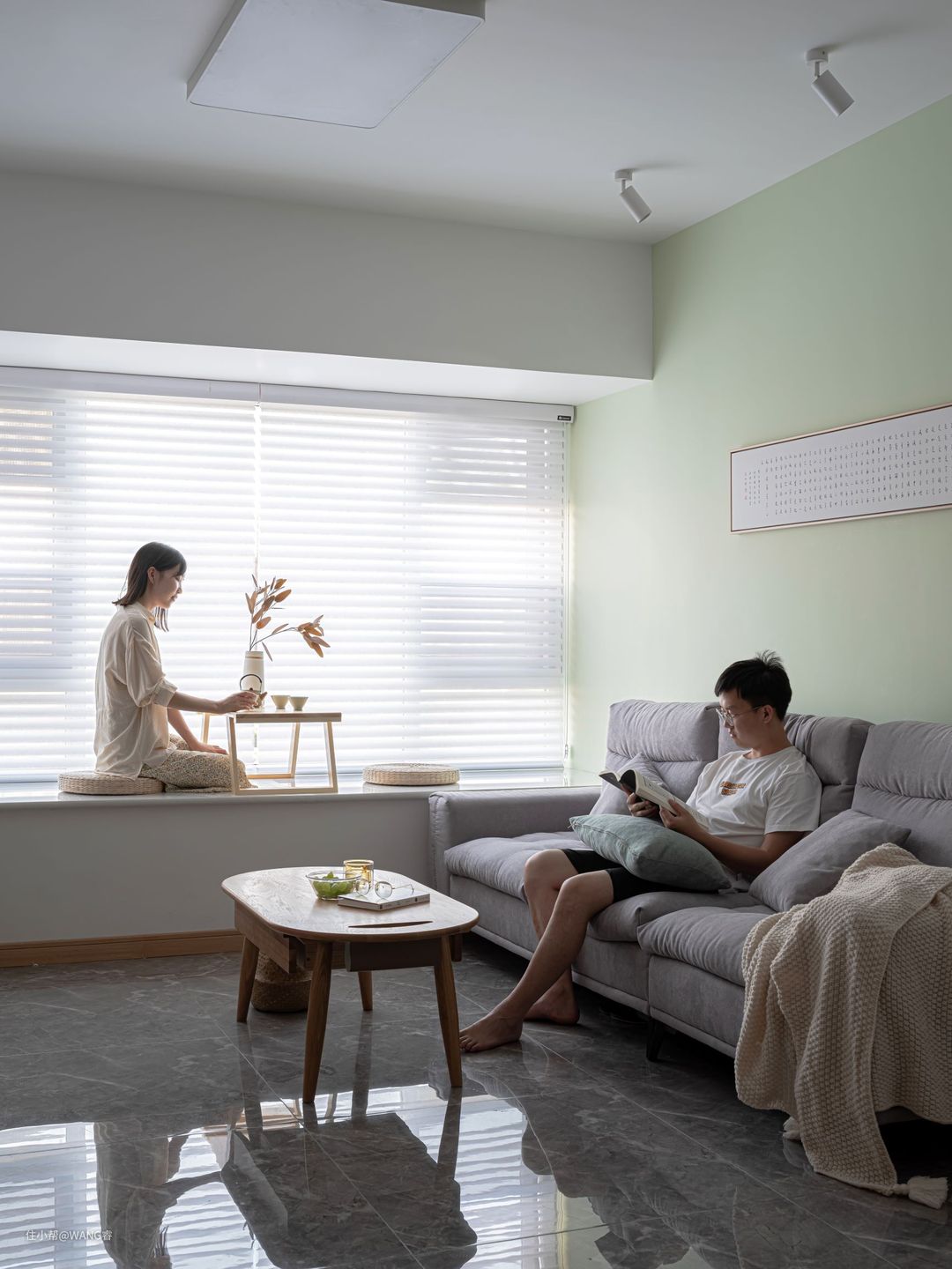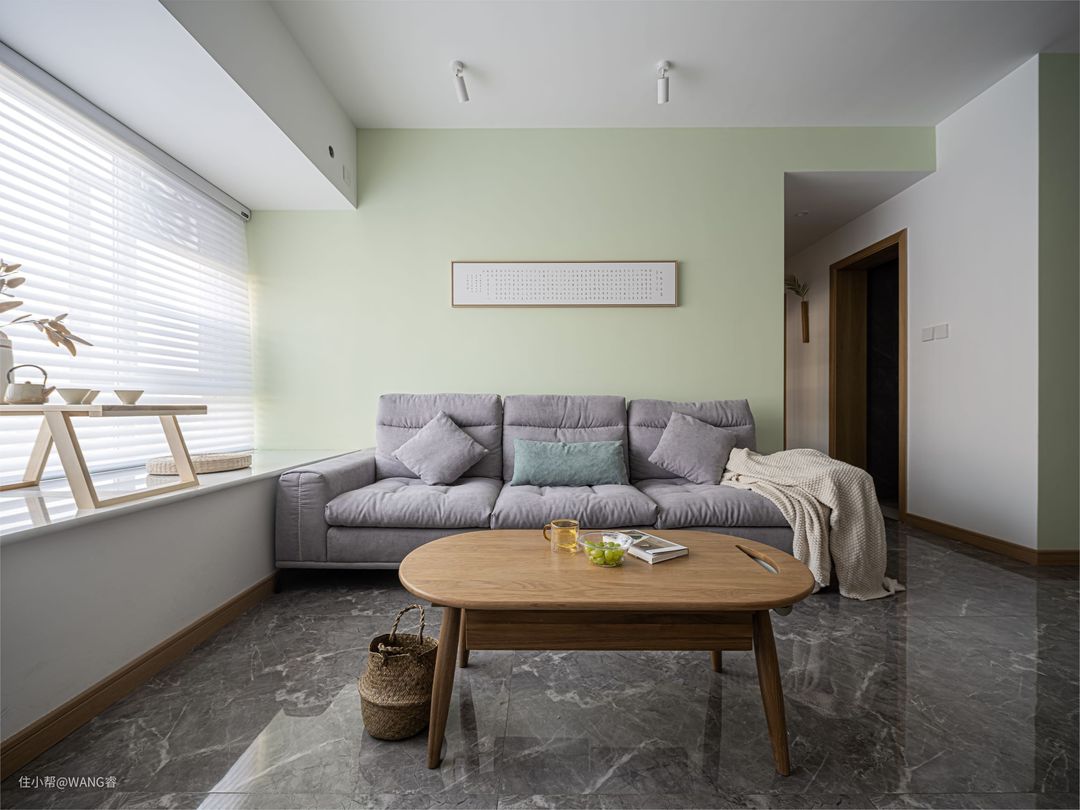 整体调性是简单.自然舒适的感觉.全屋以白色为主.只局部添加了一个柔和的绿色.茶几下方有一个剑麻地毯.但拍摄时还未运到.所以只能自行脑补下效果了.