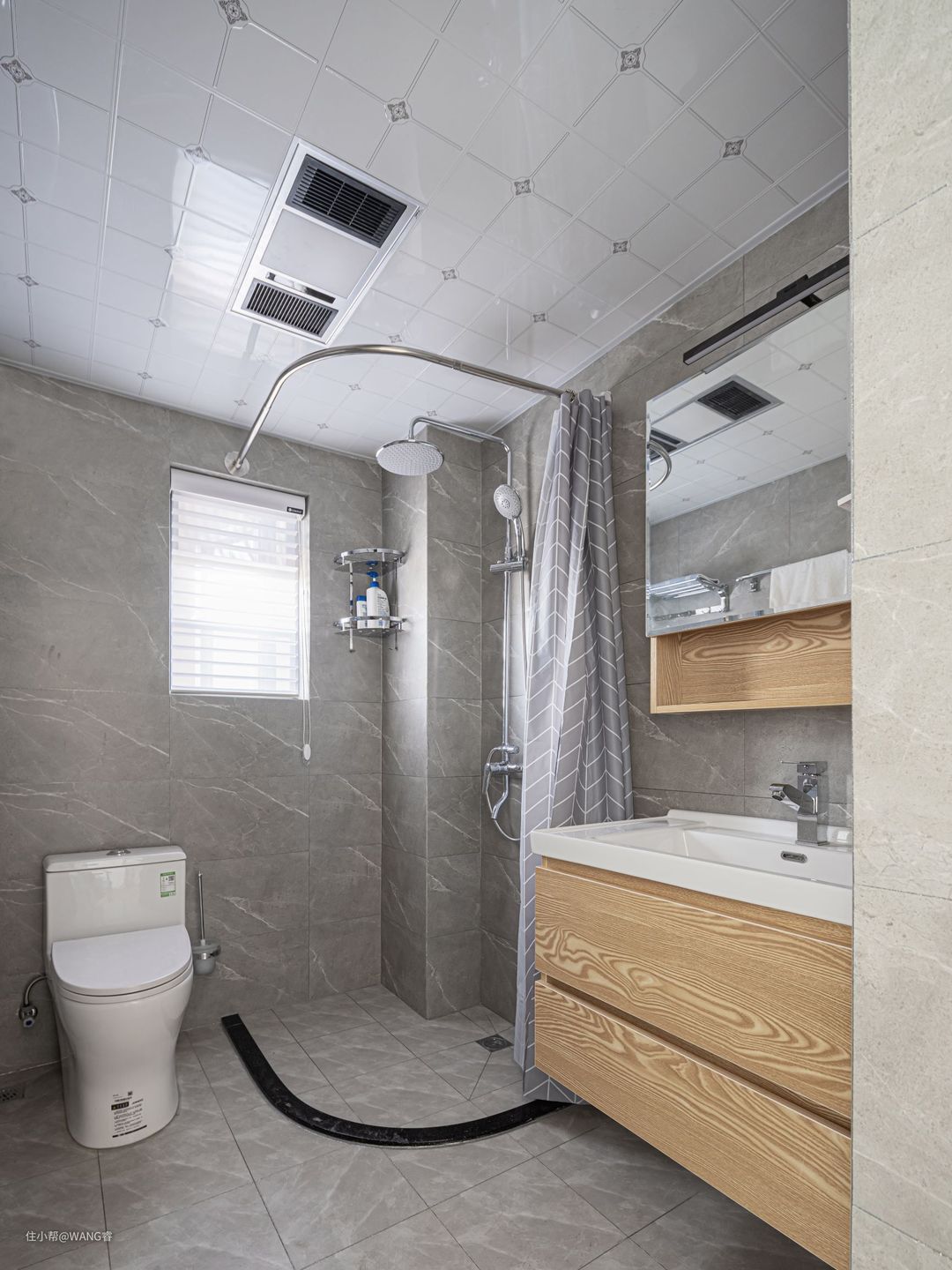 主卫延续整体风格调性,用了灰色砖与木质的搭配,由于尺寸的大小,以及窗户的位置收口,在平面布局中考虑了浴帘,放弃了玻璃淋浴隔断的使用,让空间显得开阔一些.
