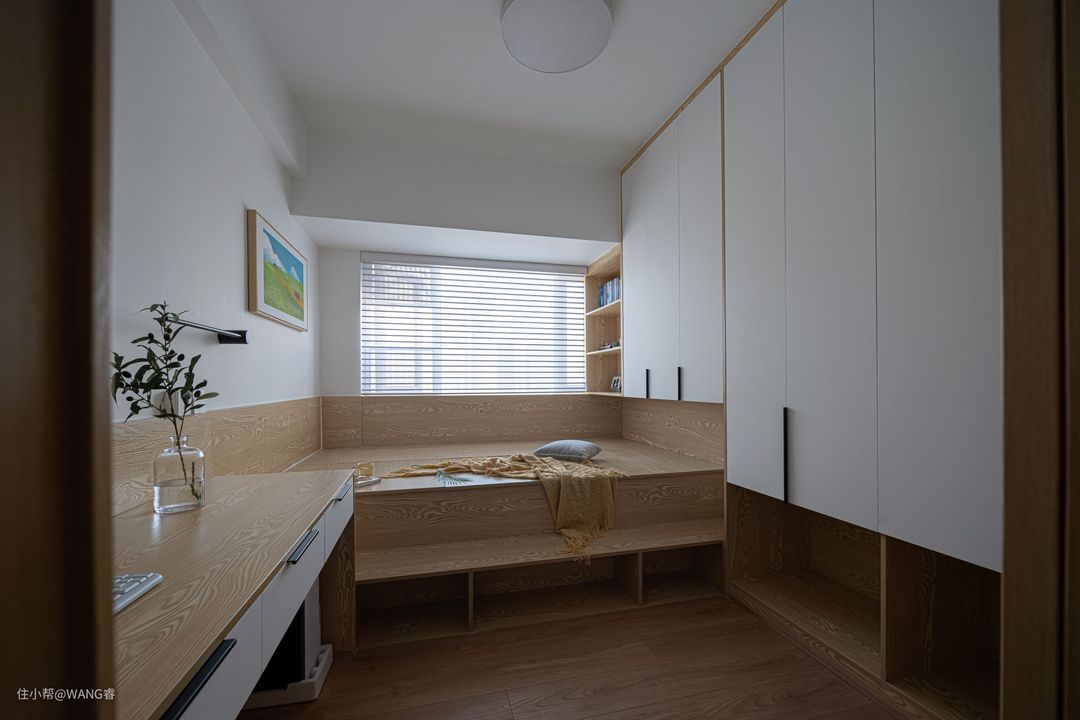 根据功能将柜子分为不同收纳,而悬挂柜下方的护板顺延至床头,满足功能的同时保证空间的统一.