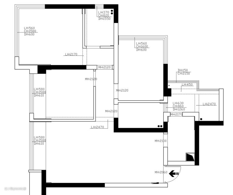 1-原有户型过道光线相对较弱; 2-门与门距离太近,影响两个次卧布局,同时让过道没有细节.