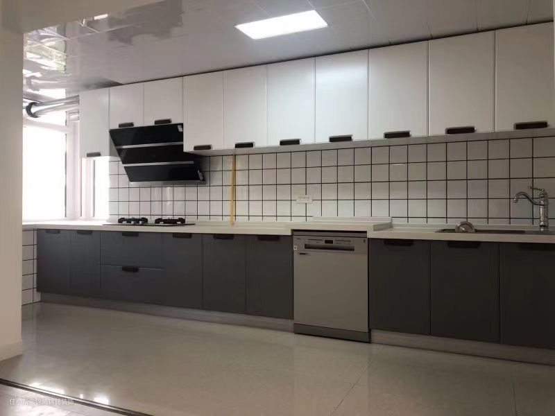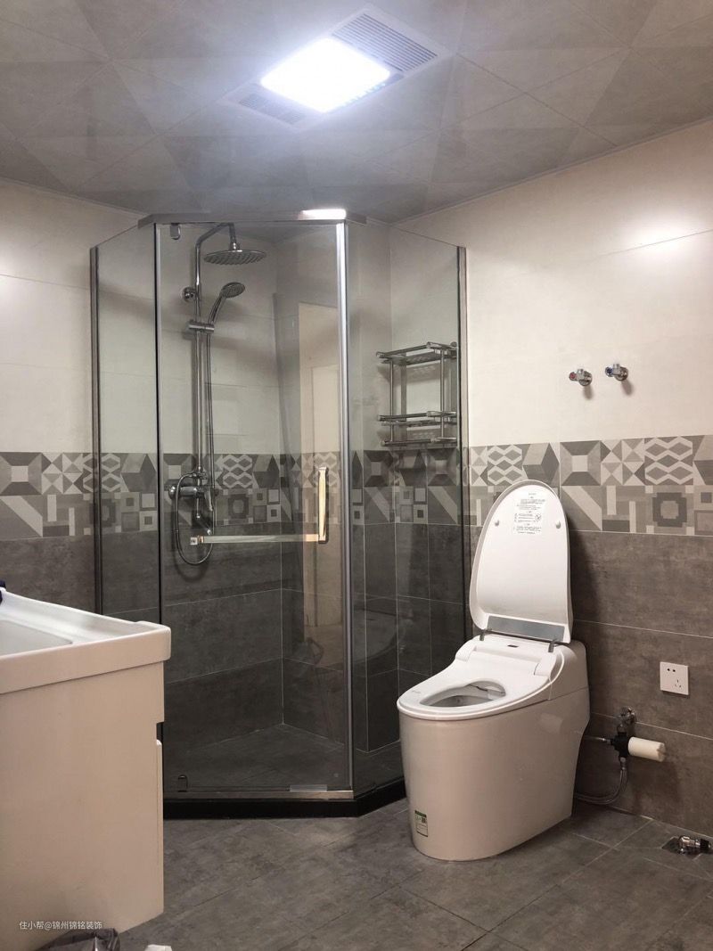 原来门位于淋雨房侧出去是厨房。改变朝向。采用灰色瓷砖,现代感强,地砖采用防滑砖设计,实用性强,墙砖上下分色,有层次感。
