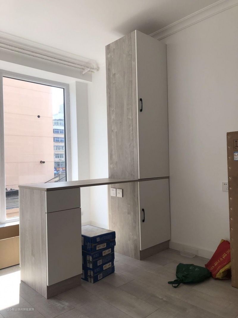 业主喜欢阳光,在近阳台的位置坐了个小吧台,技能遮挡部分直射沙发的阳光,又能平时办公,喝水,休息,看看外面的风景。旁边收纳柜,便于取用日常用品。