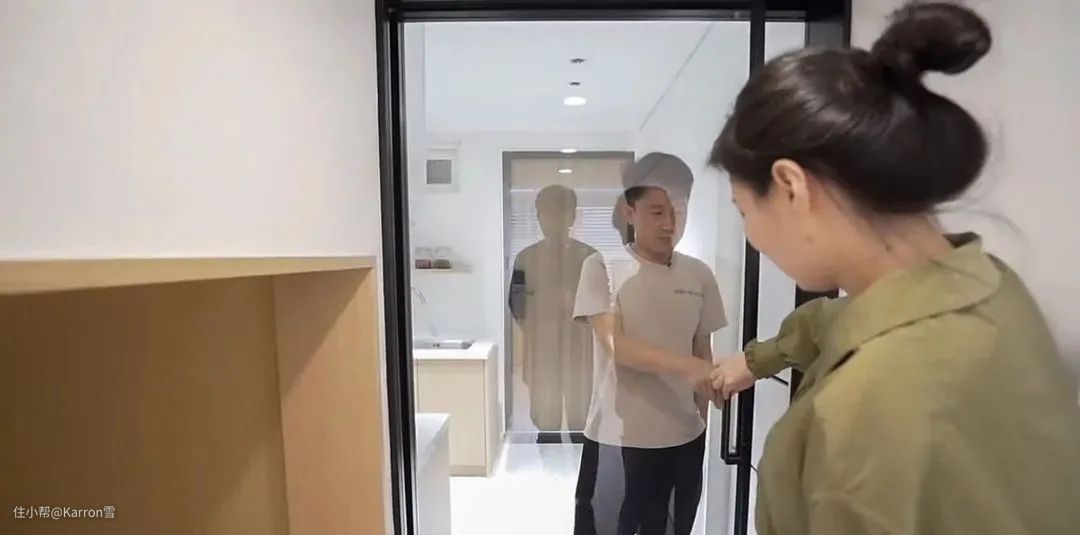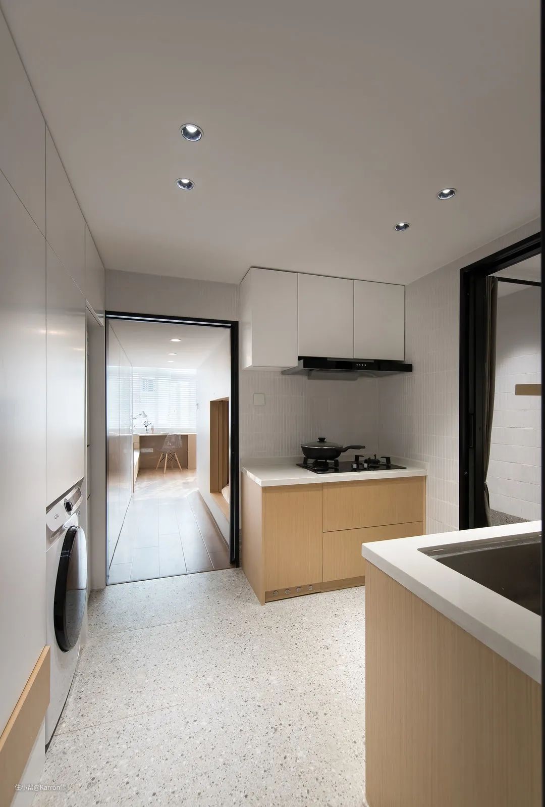 包括黑色门框里设计了隐藏式的玻璃推拉门,有油烟时,将这个门关起来,厨房就是一个独立的空间,不仅阻挡了油烟,视觉上还是通透明亮的。