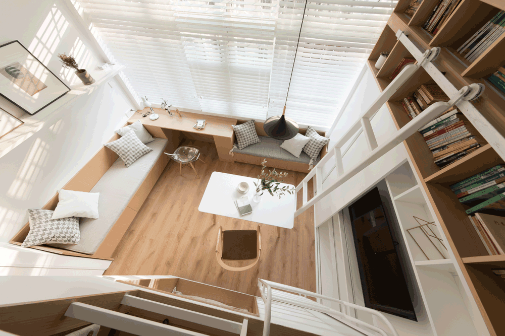 一楼 整个空间划分出了客厅、厨房、卫生间、学习区以及四个人的卧室,为了保证大量的收纳,设计了22立方的储物收纳空间,这个空间几乎是利用到了极致。