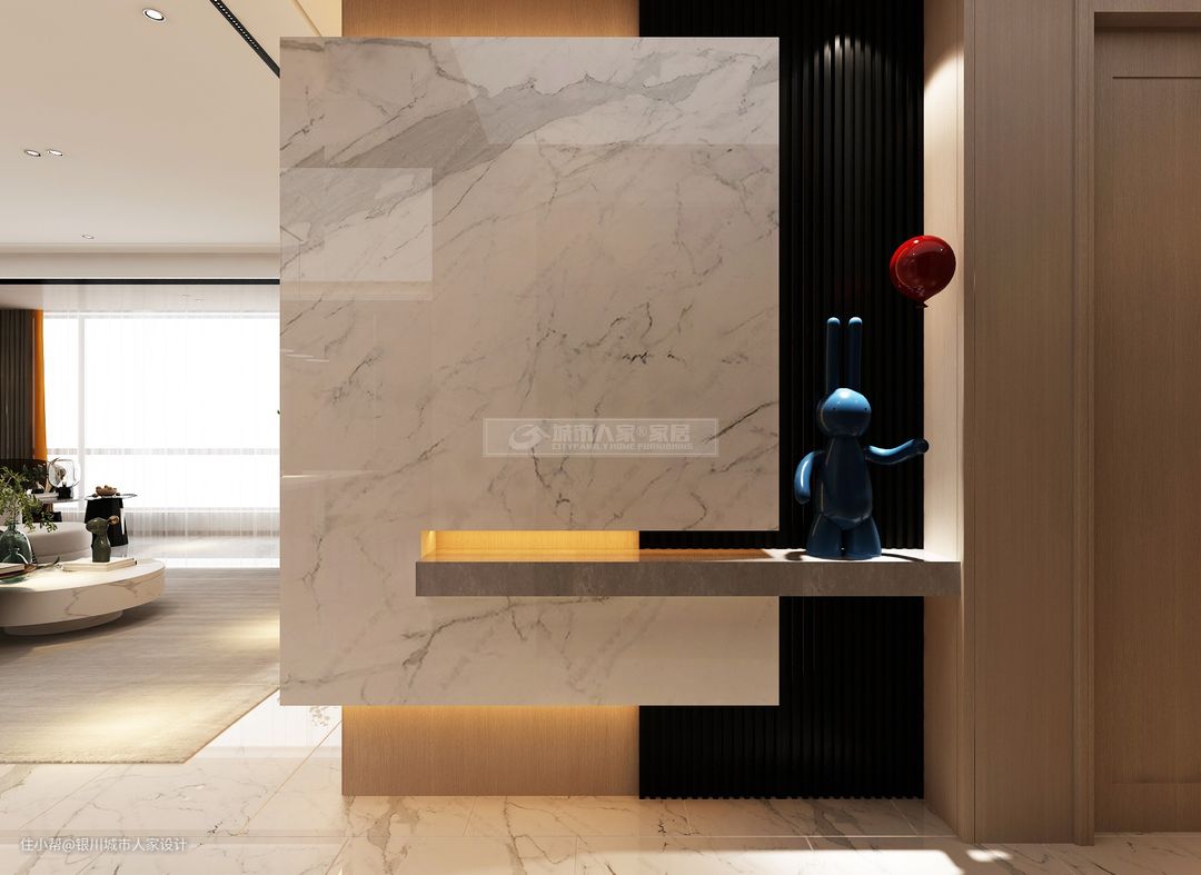 大爱这个玄关墙,石材与金属的搭配,黑白双色的拼接让原本有质感的空间更显高级感,再用蓝红双色进行点缀,丰富空间色调。