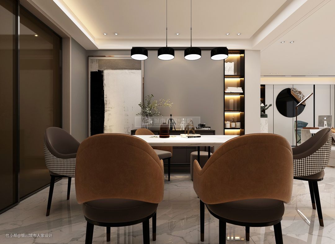 餐厅空间通透开敞,造型干净利落的顶部和墙面,棕色与灰色的组合是一种时尚与古典的碰撞,表达出的是意境美和现代感。
