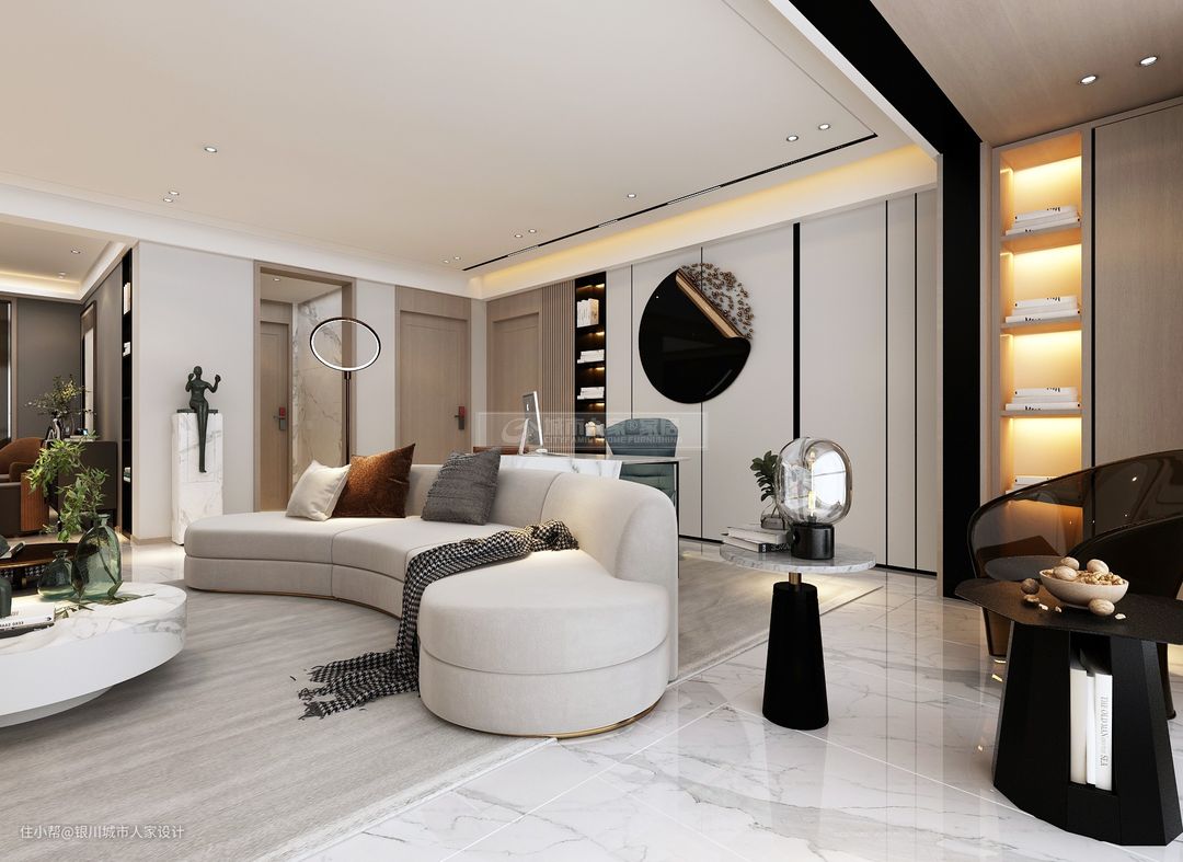 客厅给人以开敞明亮的视觉观感,为空间量身定制的沙发与书房的完美相连。