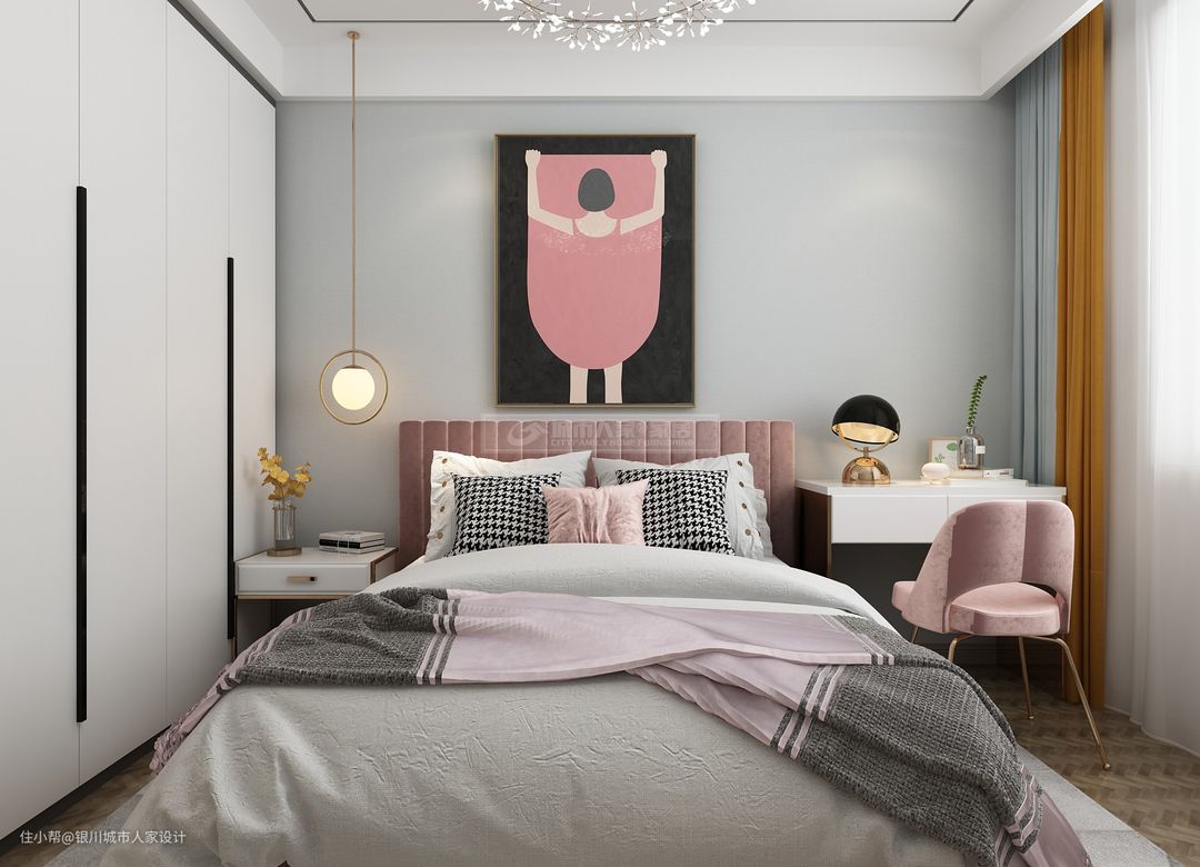 次卧的高级感是从这些嫩嫩的水粉体现的,粉色的甜蜜加上灰色的低调,甜而不腻。