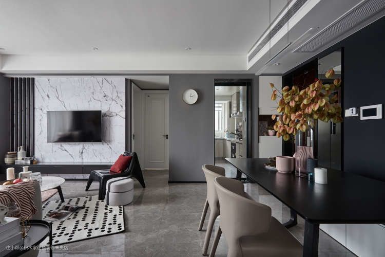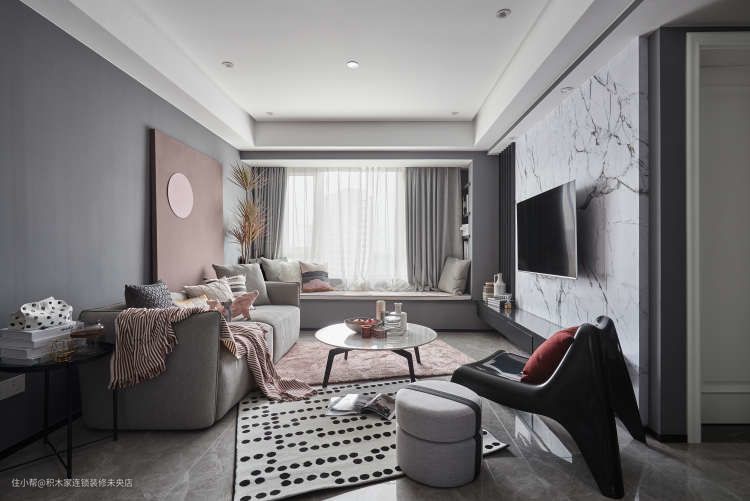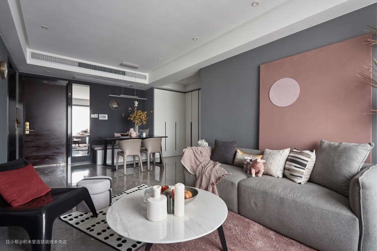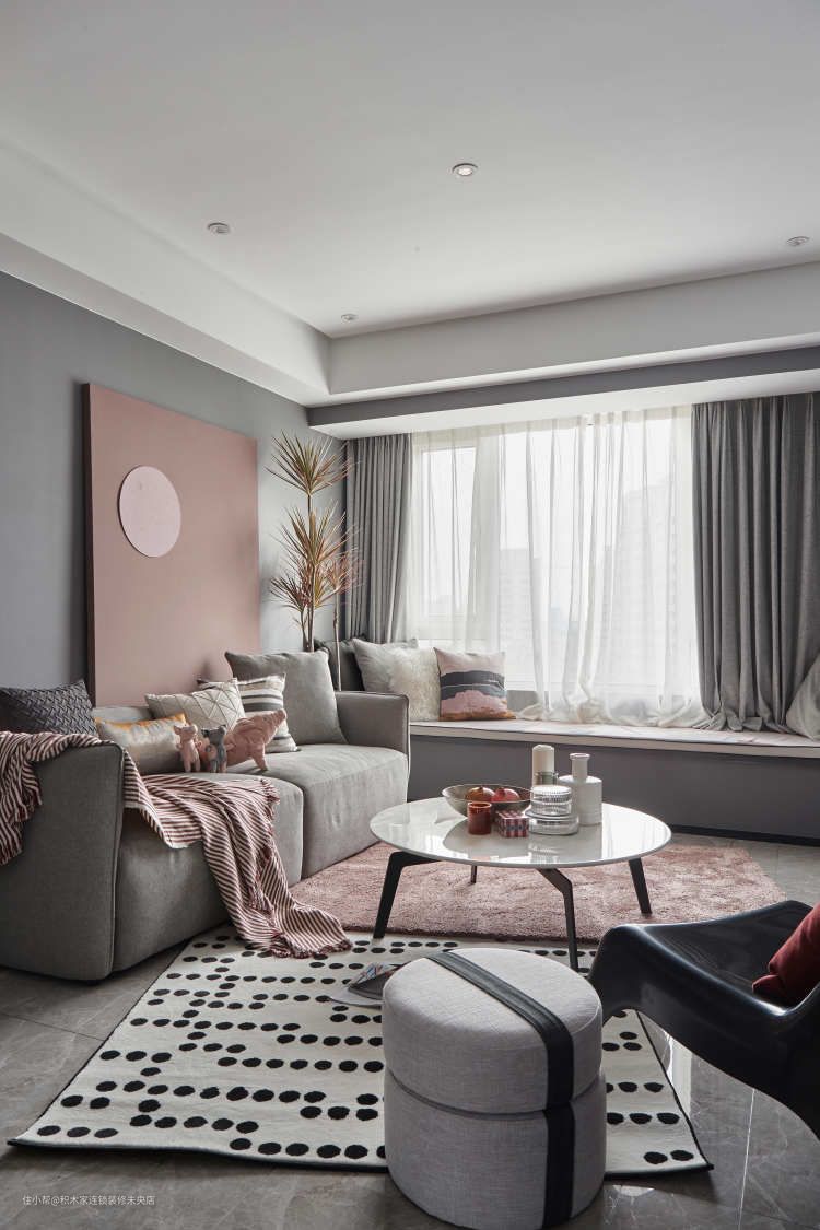 黑波点块毯和烟粉色地毯交叠,使本来平淡的灰色调客厅瞬间个性十足,颜值爆升。