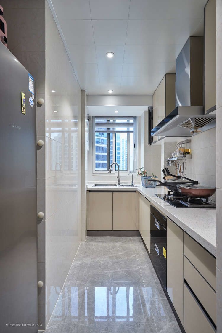 小厨房适合选用浅色系的瓷砖和橱柜,会显得空间大很多。全屋统一使用同色温和照度的射灯,比集成吊顶标配的平板灯照出来的光氛围更立体,更高级。