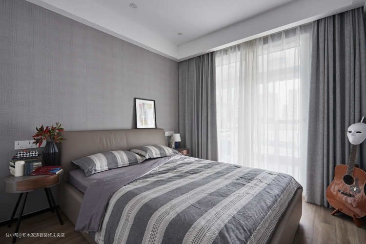 主卧纳入了原阳台作为衣帽间,一整面的落地玻璃窗带来了极好的视野和采光,让主卧的空间配比宽敞而明亮。