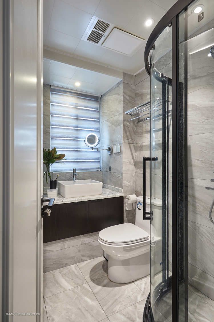 次卫结合45cm高的飘窗做洗脸台,解决了与淋浴房、马桶三者之间的设置问题。墙地同色的大理石纹瓷砖让本来局促的次卫变得敞亮。