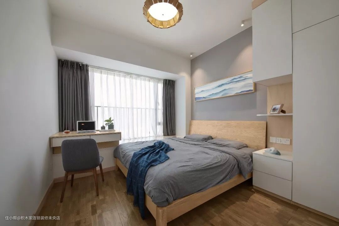 客厅浅灰色的布艺沙发,搭配原木的椭圆形茶几,十分简约。餐厅餐厅里选择原色的餐桌椅,看起来很有质感。厨房主卧主卧里采用了筒灯和隐藏灯带照明,舒适的灯光更让疲惫的身体感到放松。次卧次卧以灰色、白色、原木为主,显得轻松又温馨。书房卫生间