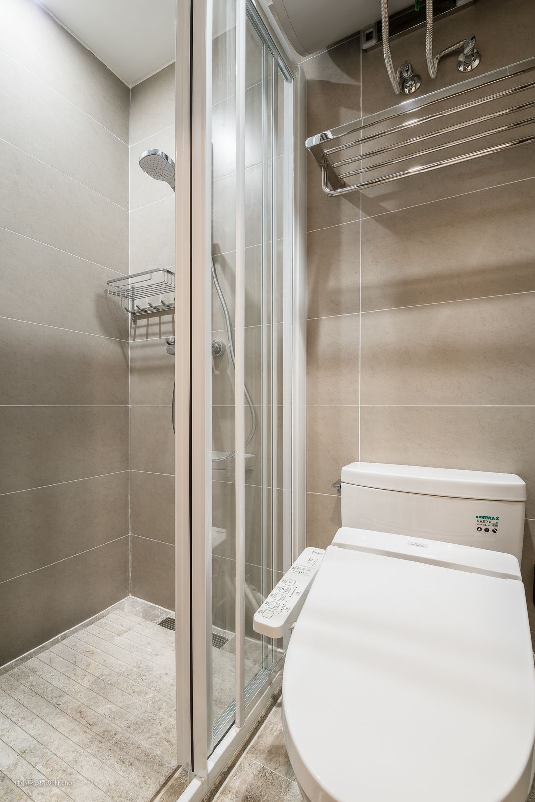 除去过道,床一侧就是靠墙定制的深度55cm的白色通顶衣柜。无把手设计显得更加简洁且在小空间避免刮蹭。