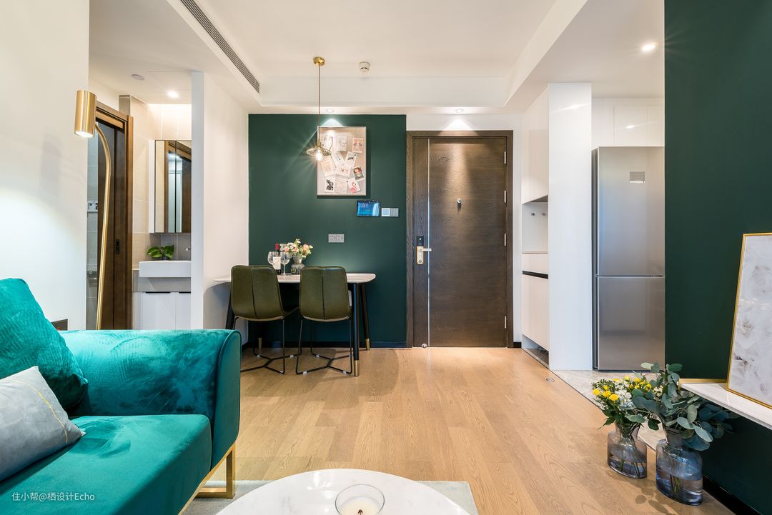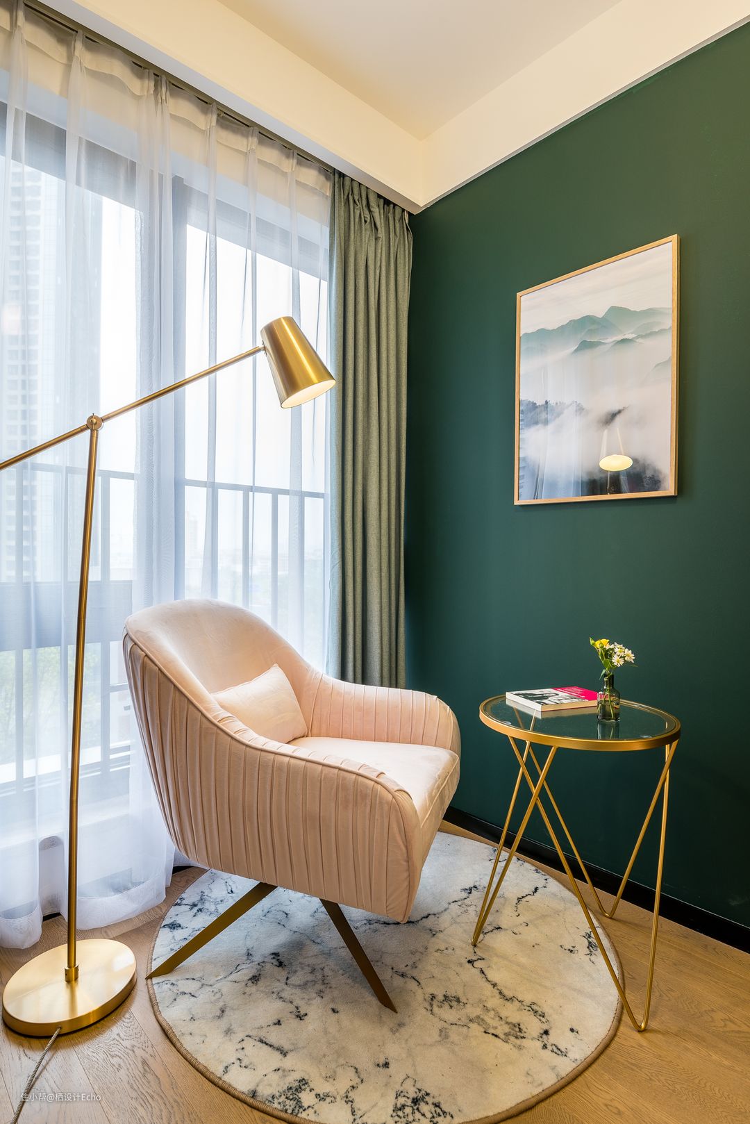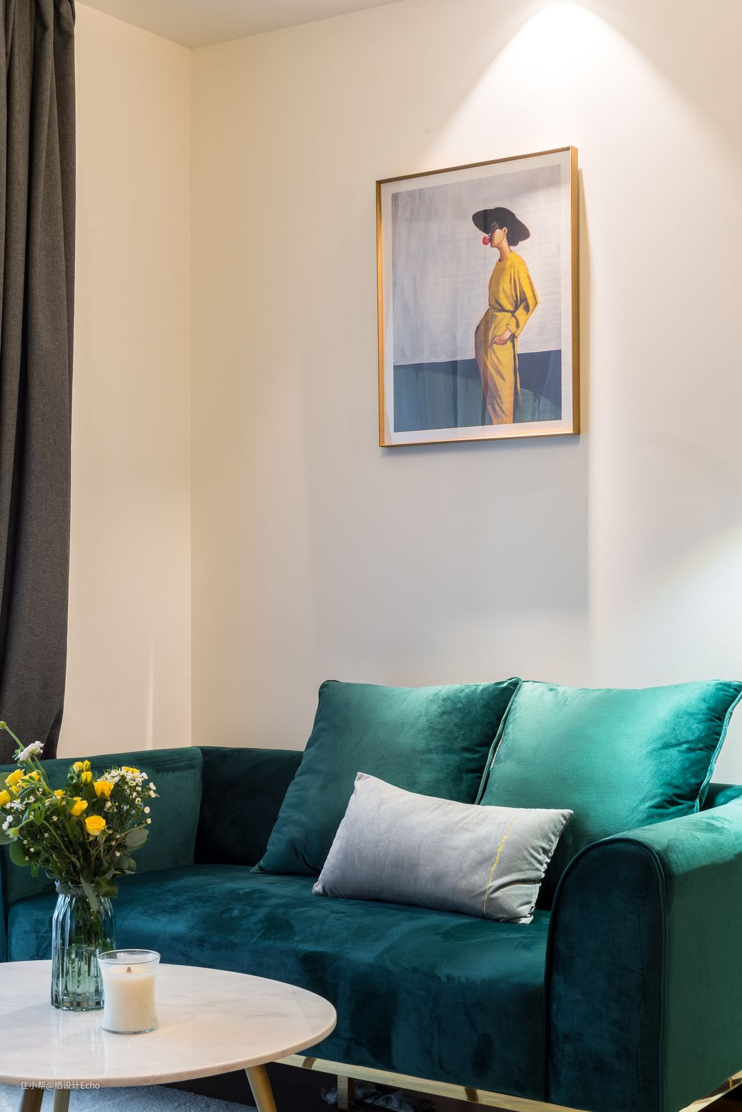 墨绿天鹅绒金属脚沙发、黄铜落地灯,这些元素打造轻奢风毫不费力,挂画选择了一副优雅的女性人像,色彩和沙发有呼应又有亮点。