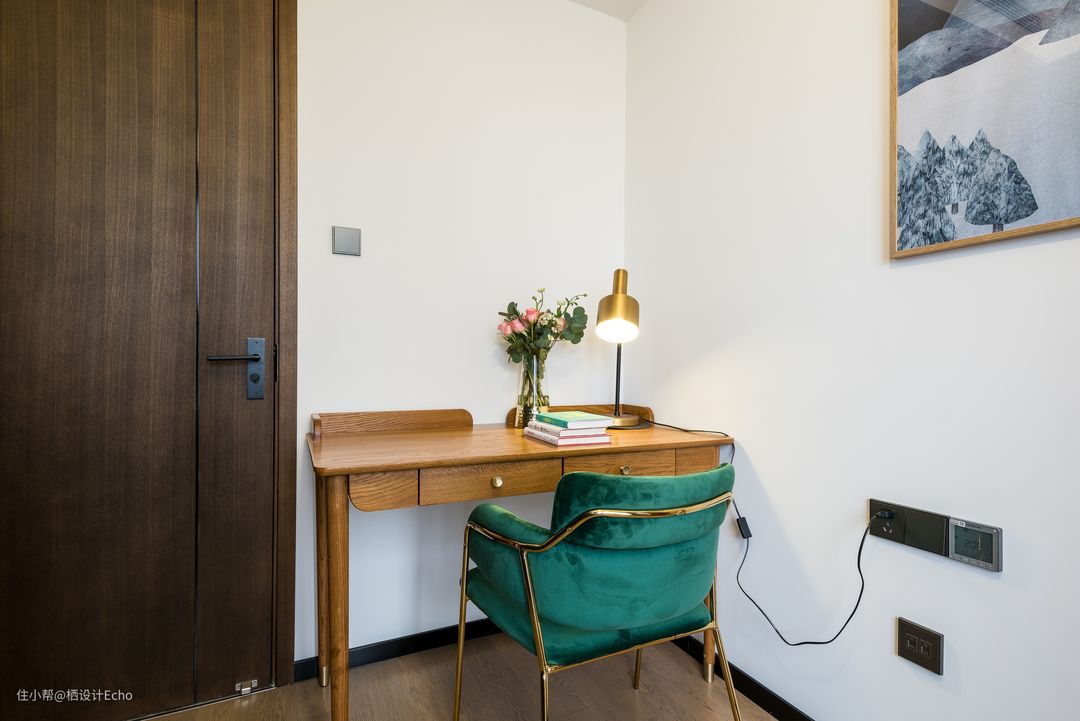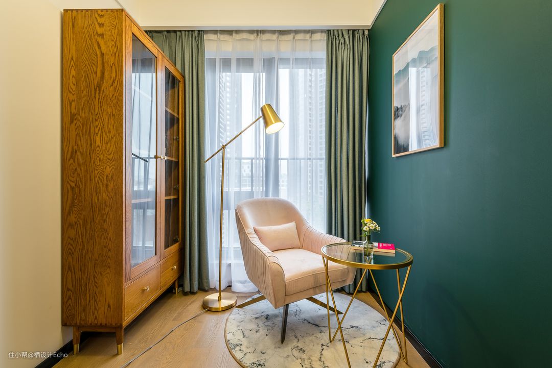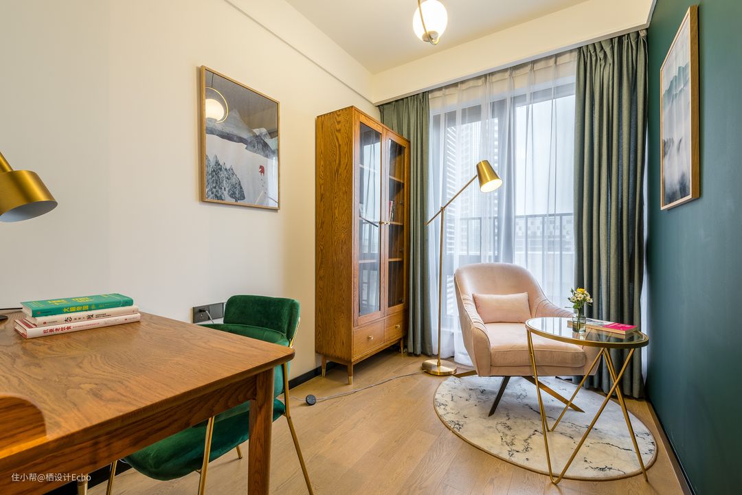 小小的房间打造了一个精致的小书房,浅粉和墨绿是一对经典cp。黄铜落地灯,深木色衣柜和书桌和墨绿色墙面的组合显得沉稳,玻璃小茶几和粉色沙发缓和了深色的厚重感。