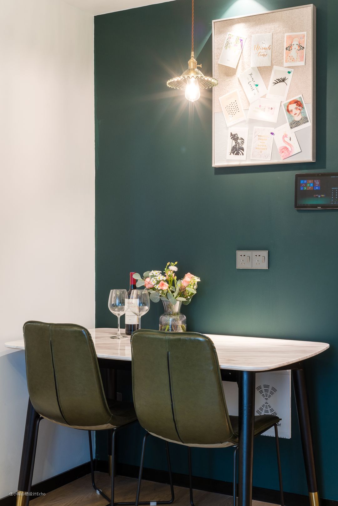 原本进门左侧的鞋柜没有改动,右侧由于有很多深色插座和开关面板在白墙上非常突兀,所以这面墙刷了业主喜欢的墨绿色,弱化深色面板的存在感。电箱用一个磁性黑板装饰。餐桌上方换了吊灯,增加就餐的氛围感。大理石桌面有高级感且容易打理。