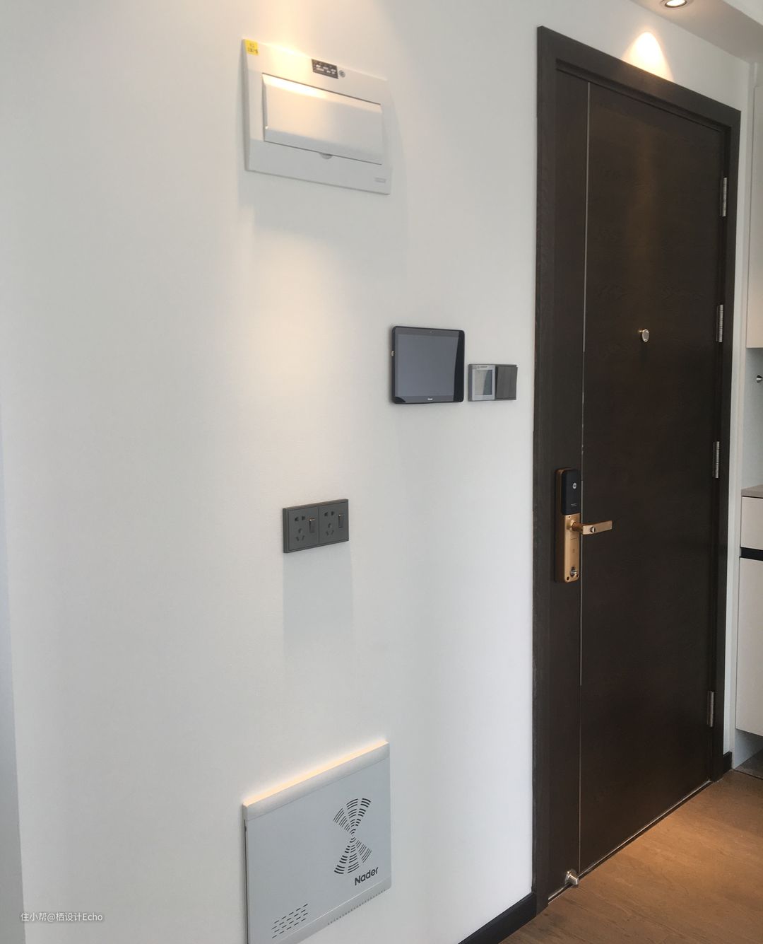 改造前--进门右手边的一面墙,摆满了插座、开关、强弱电箱、还有门禁对讲,而且很乱,分分钟要逼死强迫症的节奏。门都是这种厚重的深棕色。