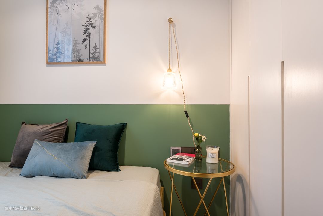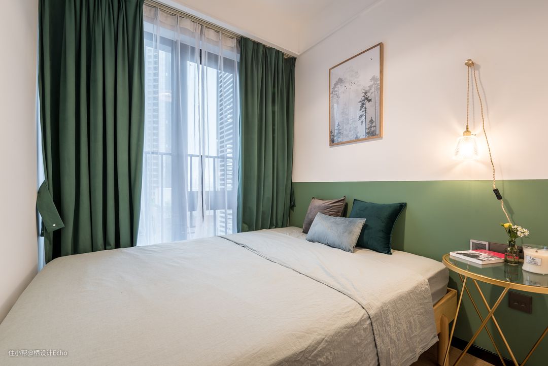 房间宽度只能放下2米长且没有床头板的床。卧室刷了半墙浅一点的绿色,窗帘用了深绿遮光很好的面料再加一层透光不透景的白纱。床头灯是插头款的,对于床头没有灯位的房间来说是很好的选择。