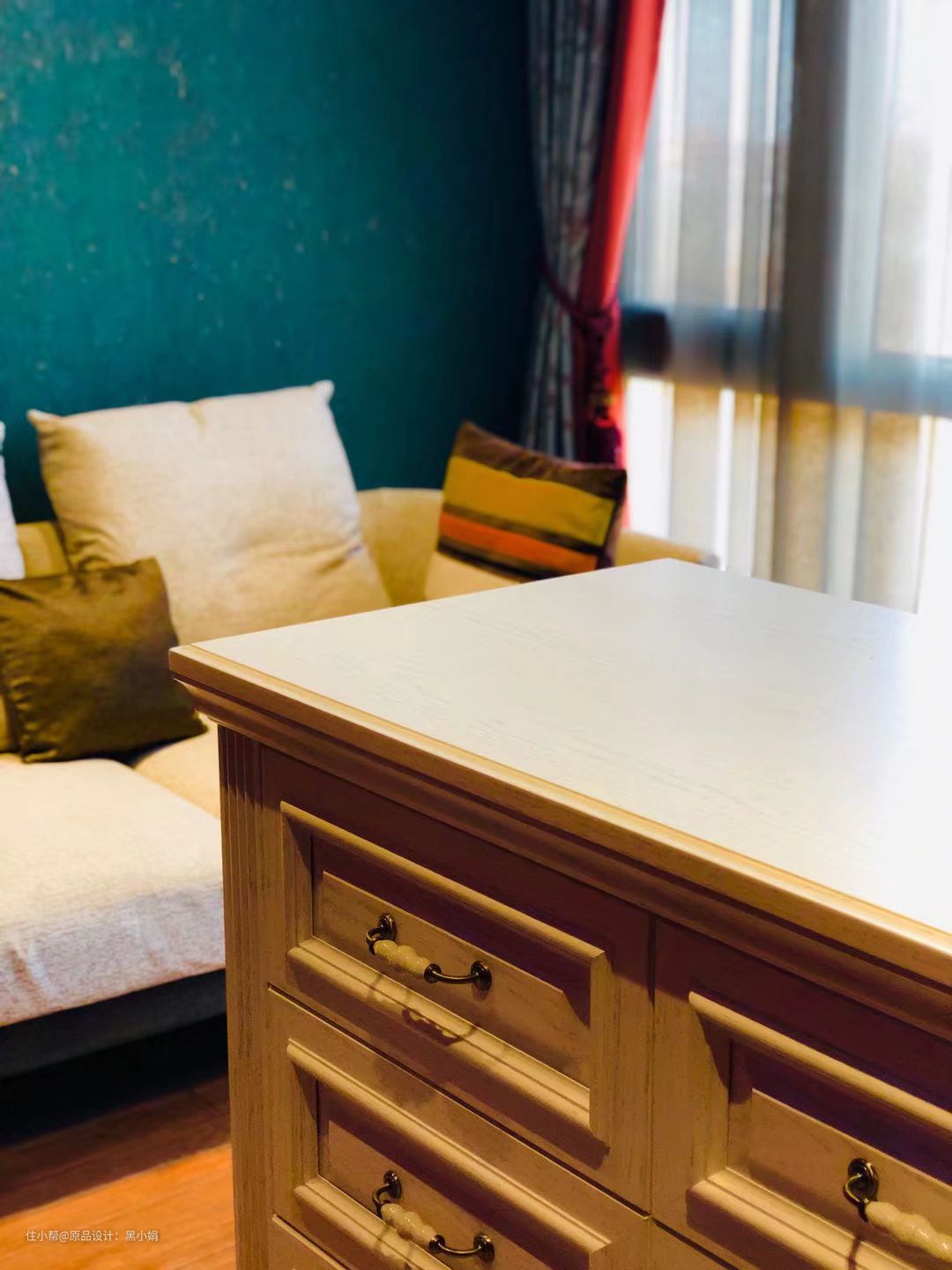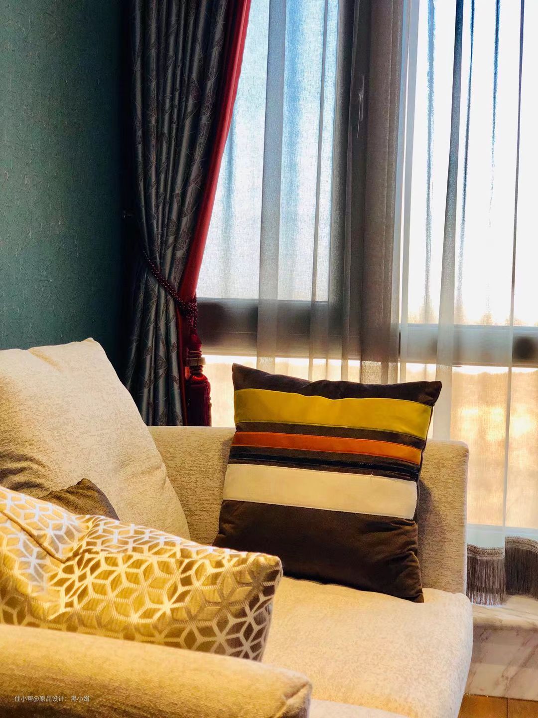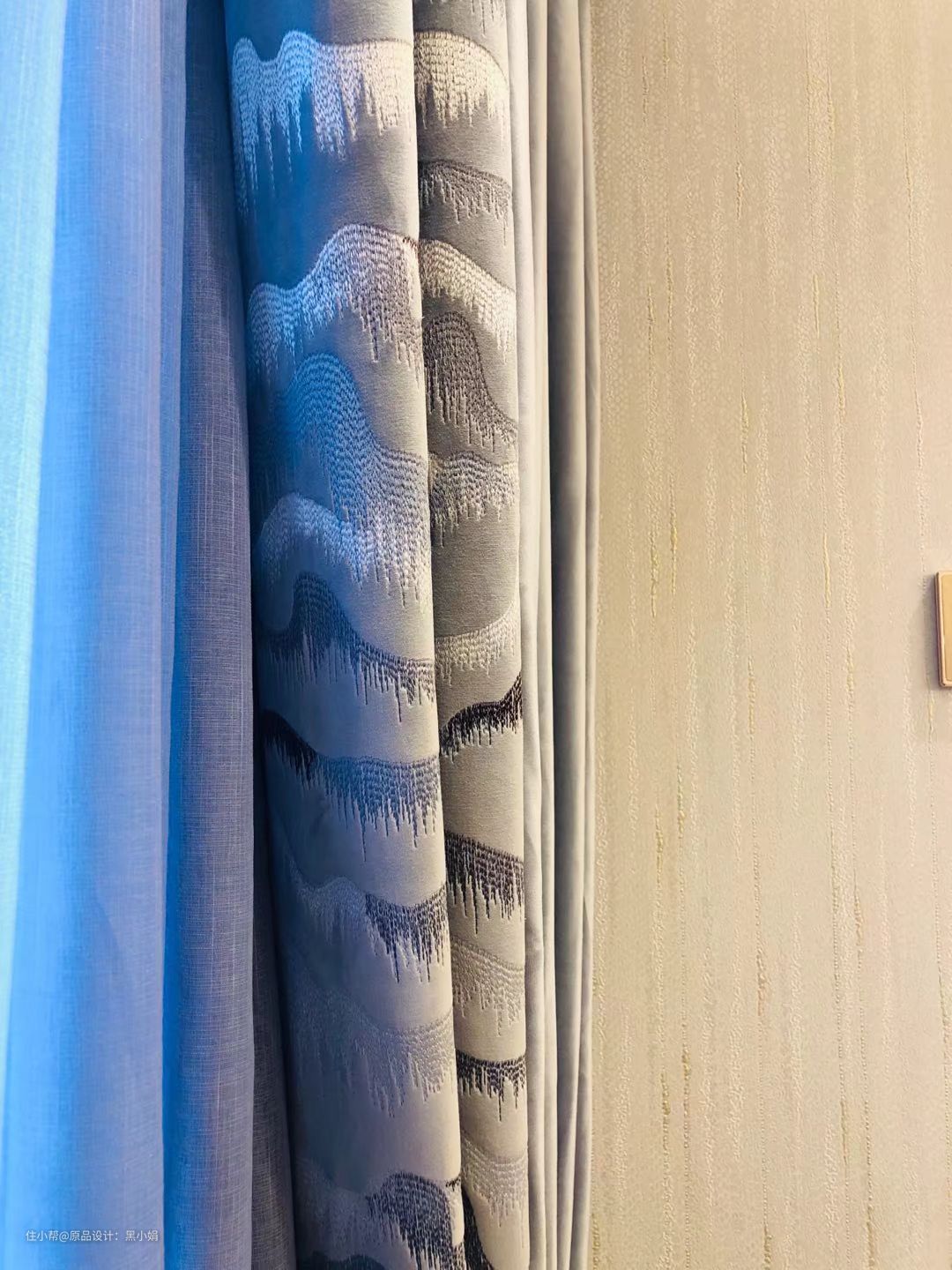 户型限制,卧室宽度不大,窗帘装在了垭口外侧。