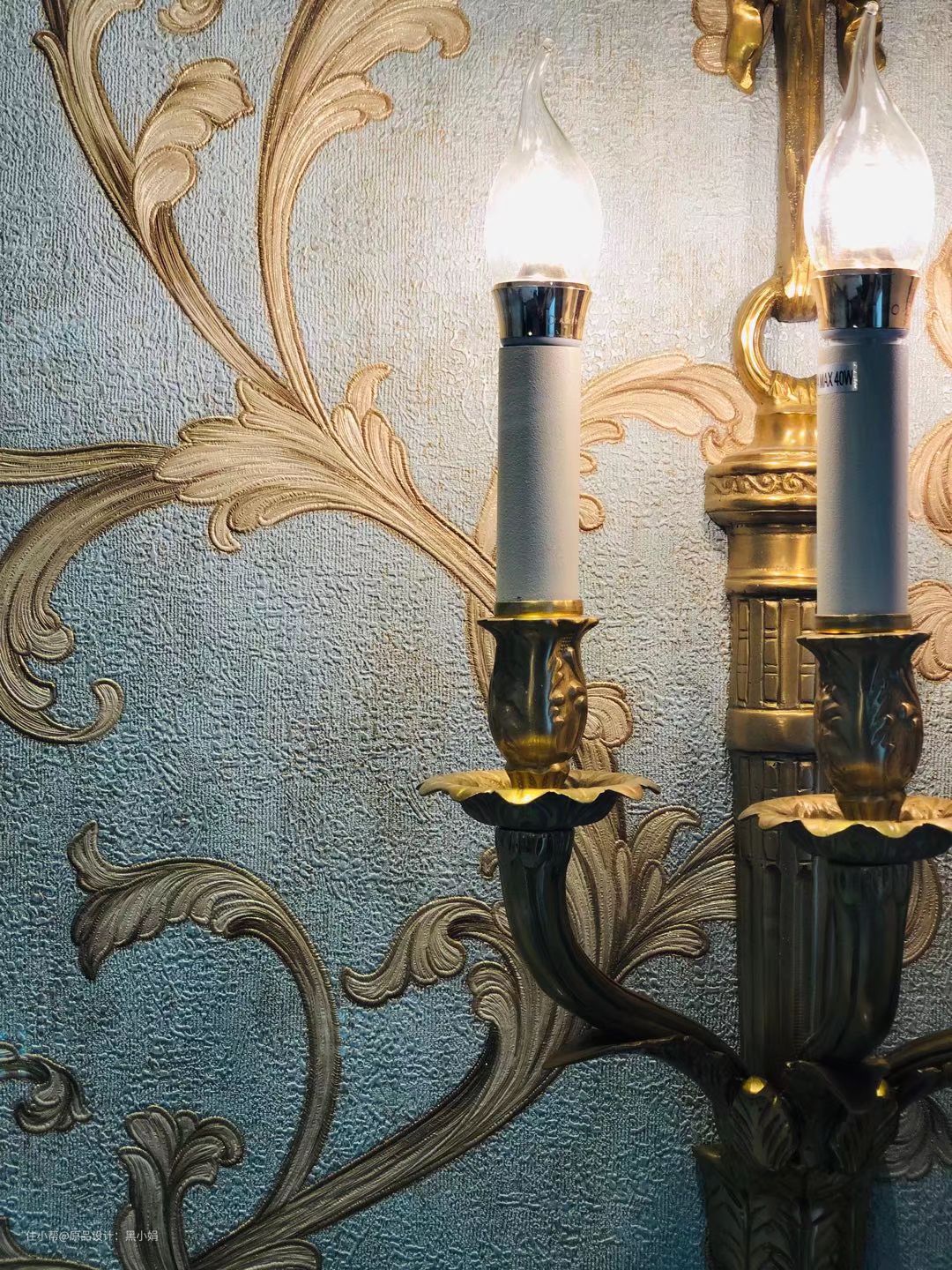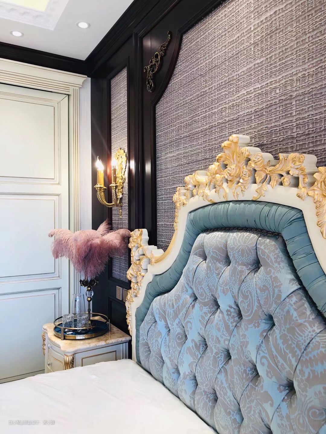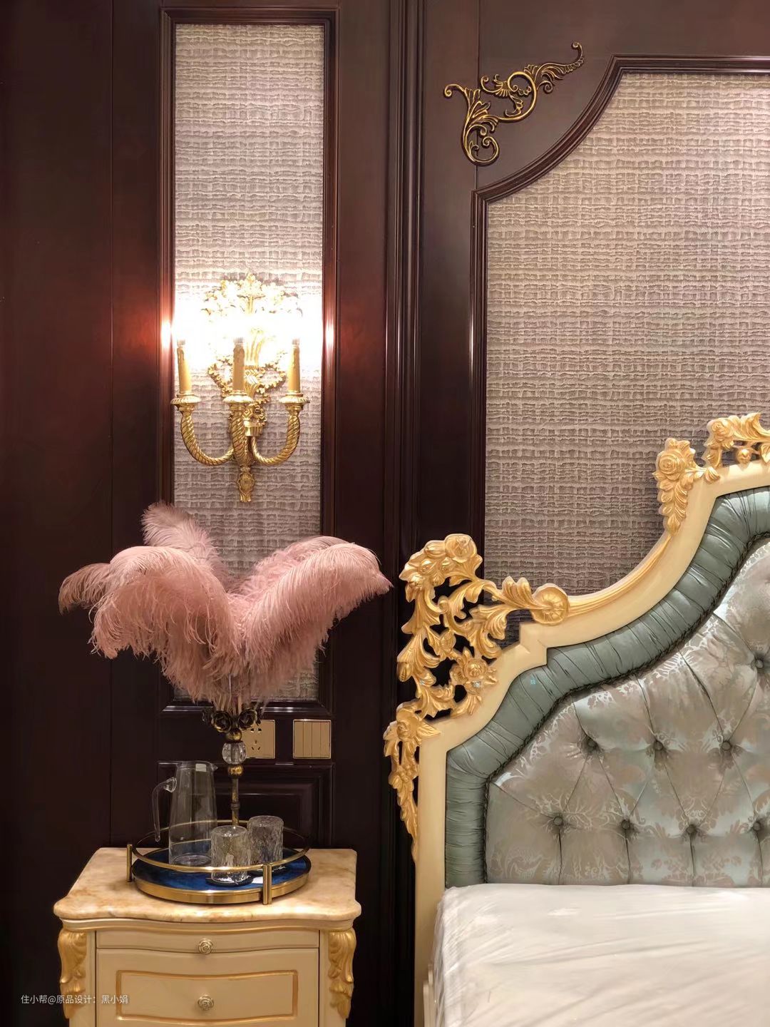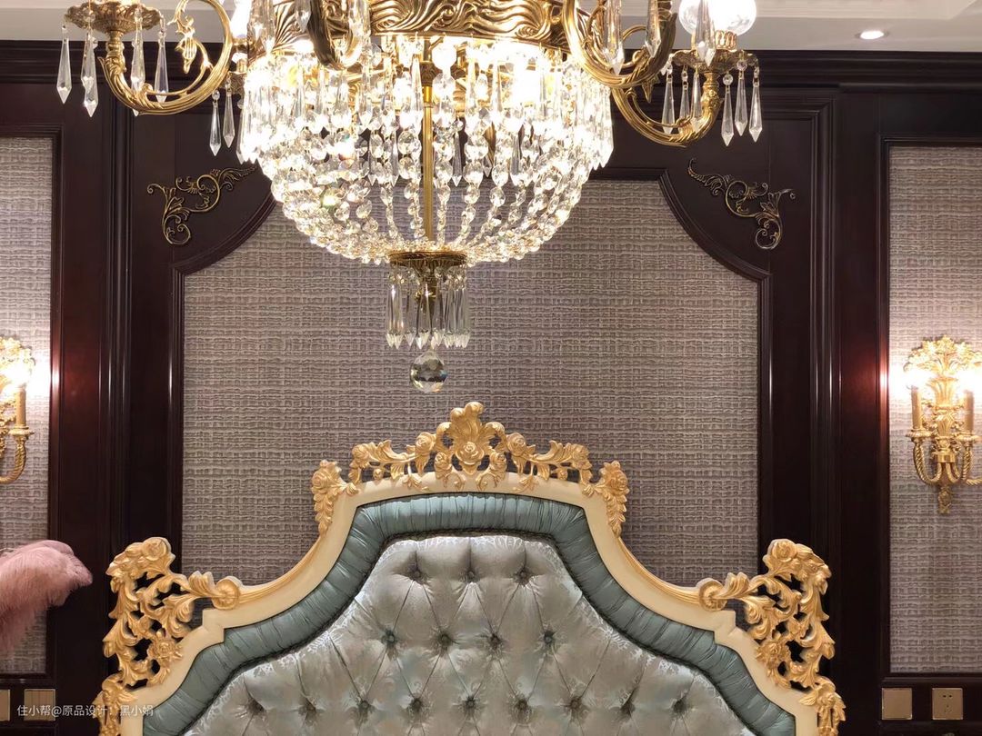 墙纸,真丝拉扣古典床,墙板,衣柜,纯铜壁灯,完美融合!