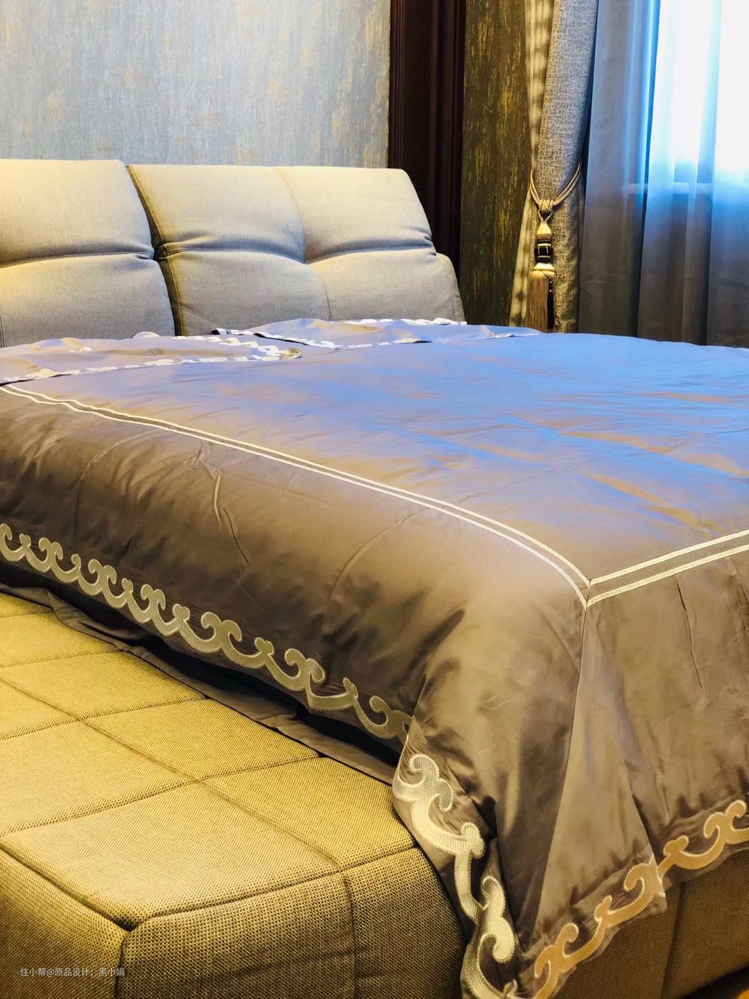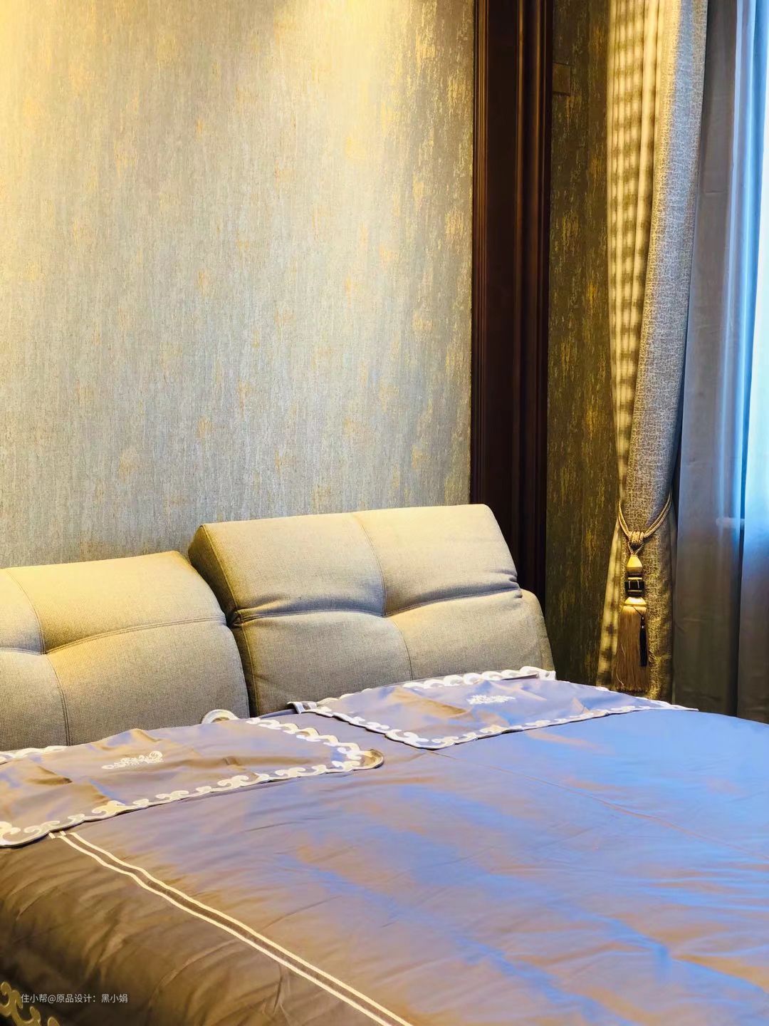 床头意大利进口面料,墙布及窗帘也结合床头面料,无论颜色和材质都细致的进行了搭配。
