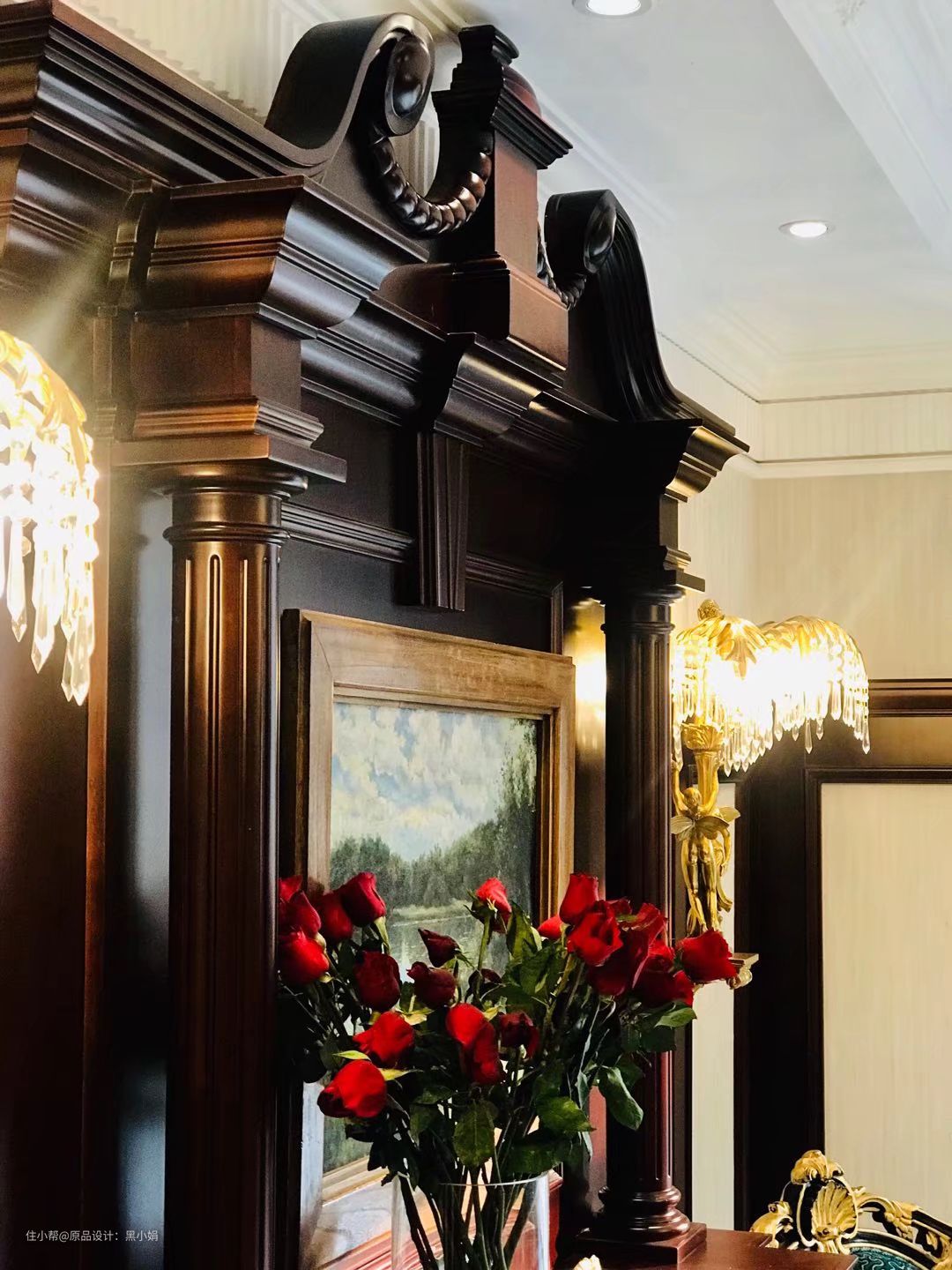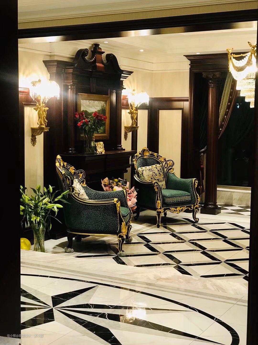幸好客厅层高比较理想,豪宅设计最关键的不能失了文化及家的温暖,于是设计了这款整体壁炉,断栅花和房子的天花融为一体,两侧配了纯铜水晶壁灯,地面却融入了黑白灰和水刀拼花,古典与时尚完美的结合。