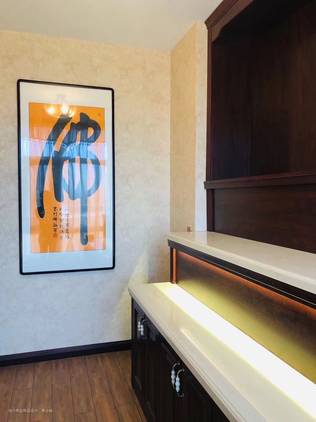 业主是一位十分虔诚的礼佛人士,佛堂设计虽简单,但每日这里的供养都十分精致。