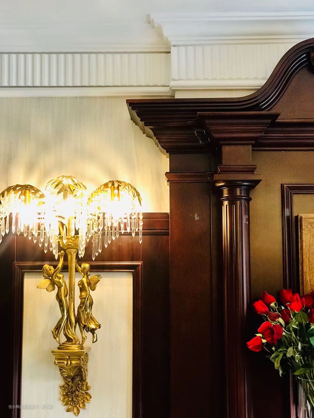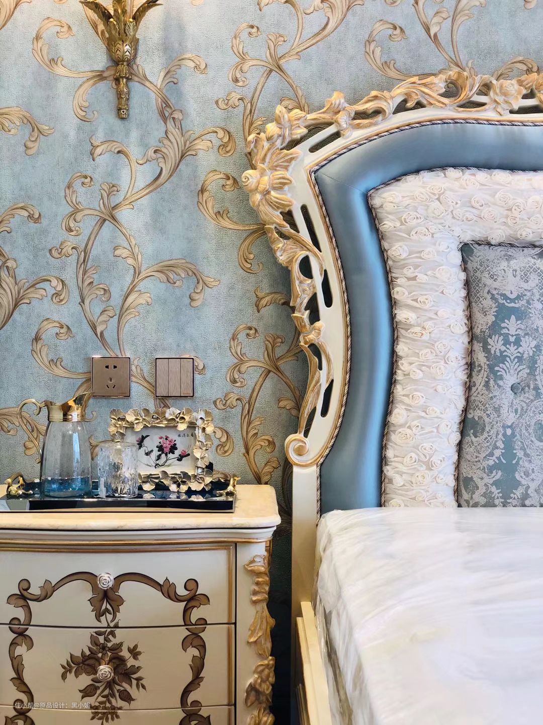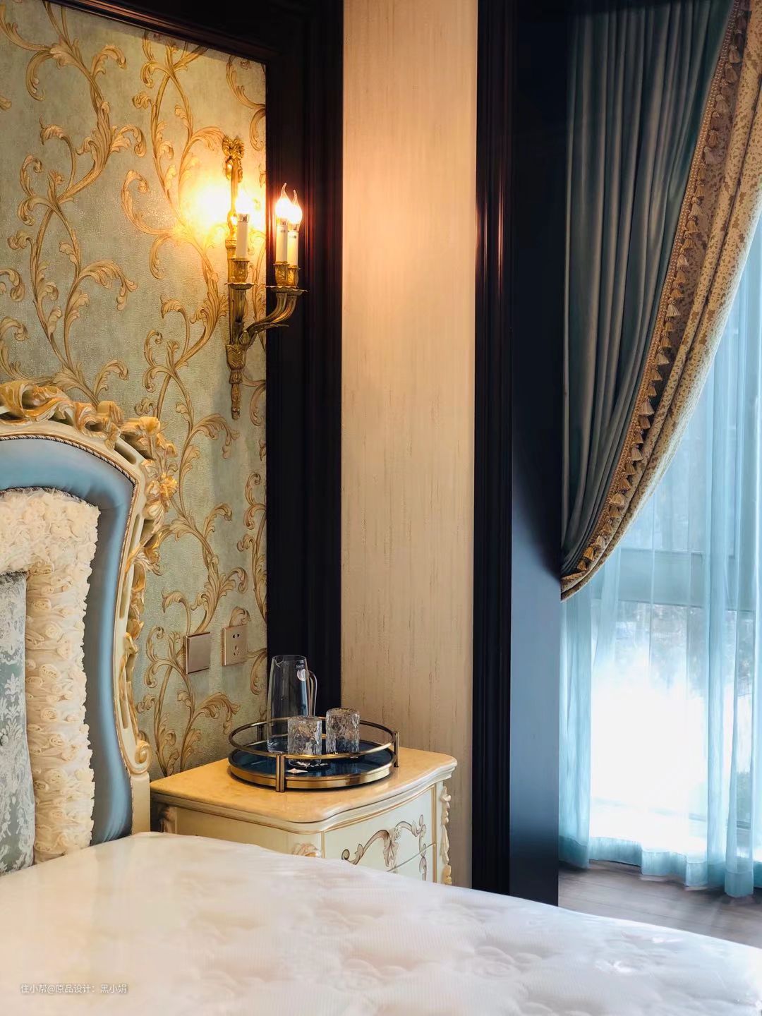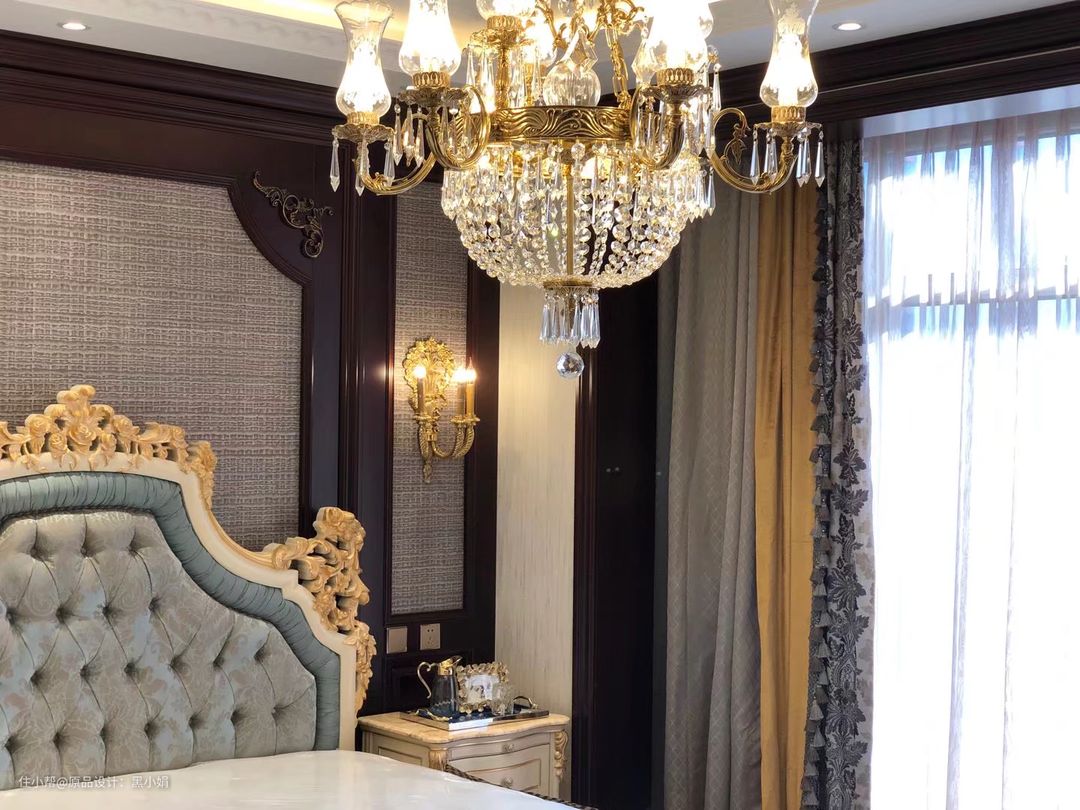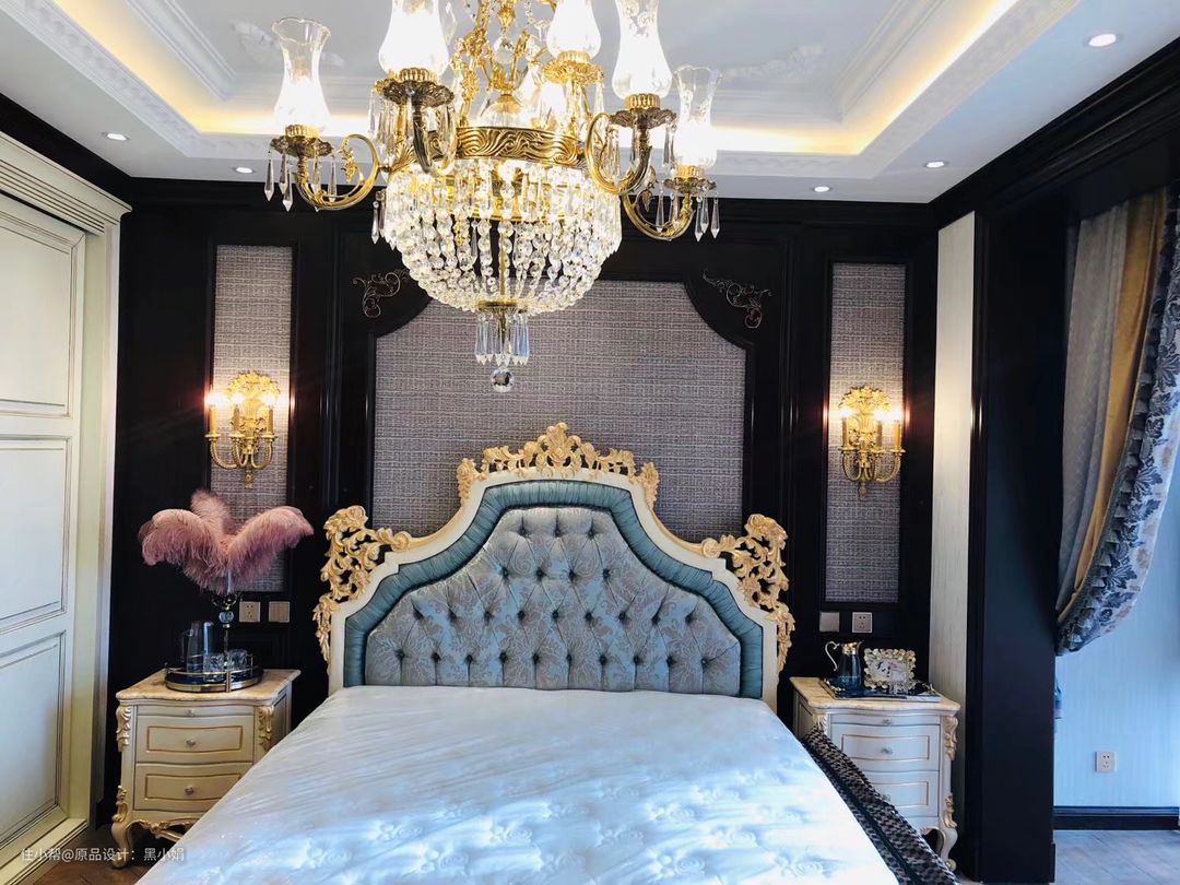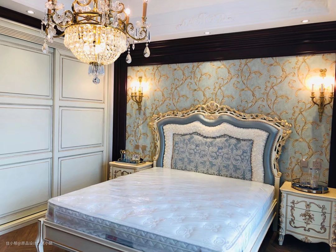墙纸,真丝拉扣古典床,墙板,衣柜,纯铜壁灯,完美融合!