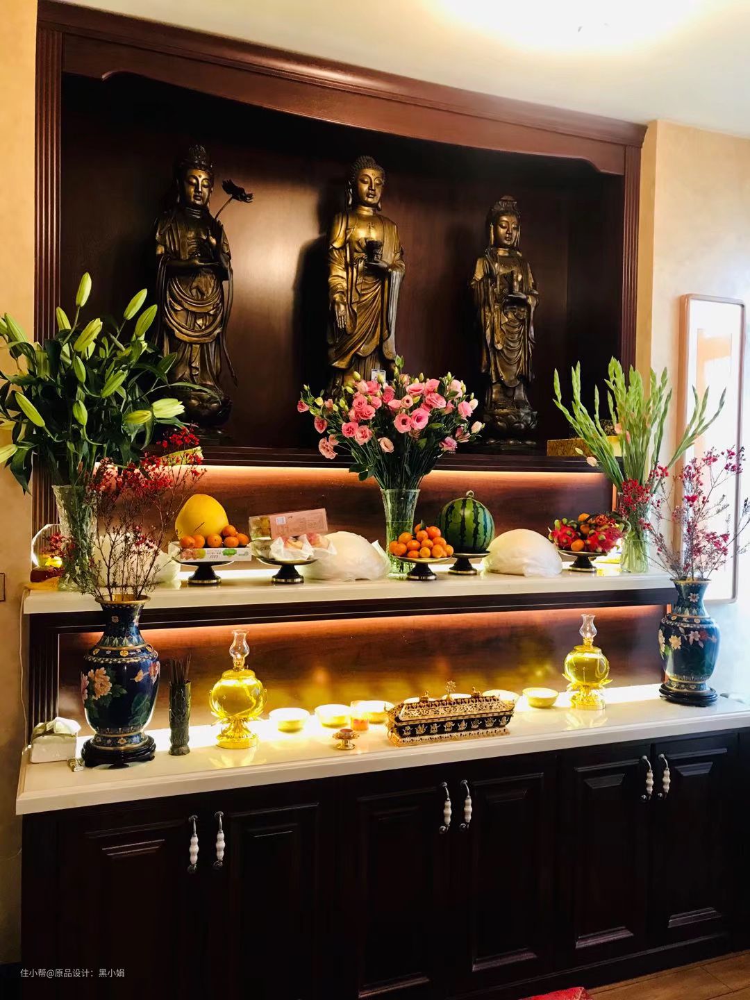 业主是一位十分虔诚的礼佛人士,佛堂设计虽简单,但每日这里的供养都十分精致。