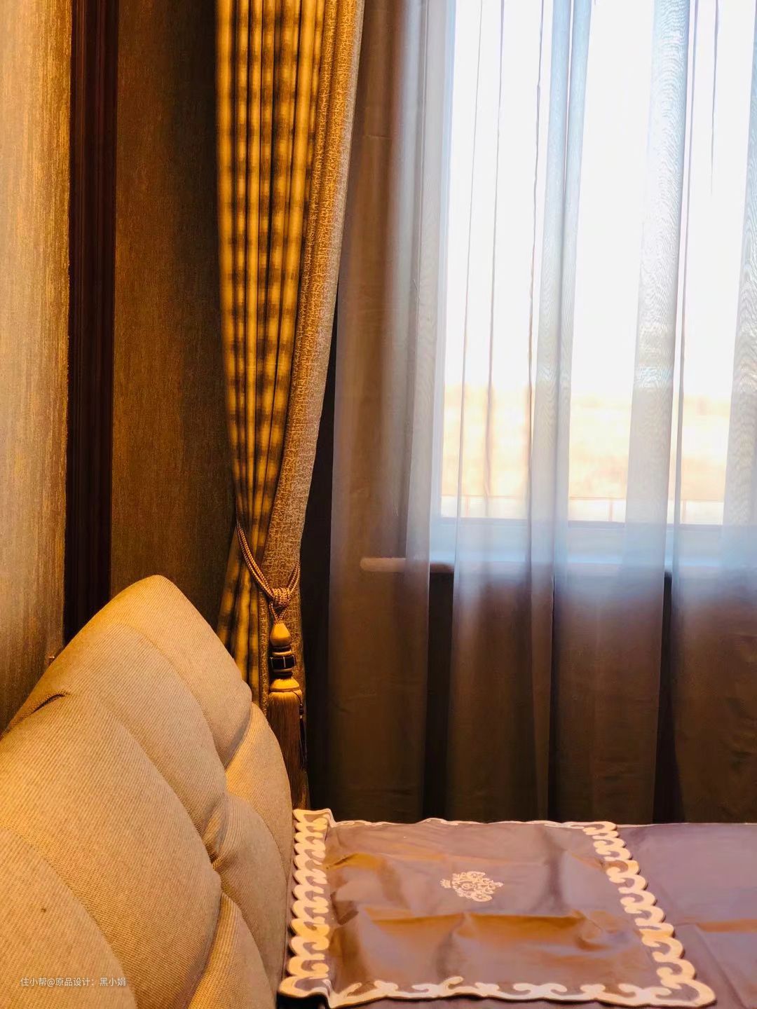 户型限制,卧室宽度不大,窗帘装在了垭口外侧。