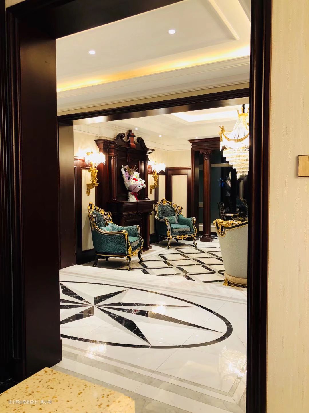 幸好客厅层高比较理想,豪宅设计最关键的不能失了文化及家的温暖,于是设计了这款整体壁炉,断栅花和房子的天花融为一体,两侧配了纯铜水晶壁灯,地面却融入了黑白灰和水刀拼花,古典与时尚完美的结合。