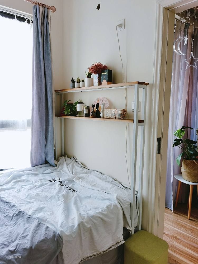 床尾部分,原来就是一个大白墙,现在增加了一个两层的窄小的置物架。感觉特别好用,是在淘宝上定制的,尺寸各种都可以自定义,超自主的。打算后期再在上方挂一幅画把那个空调孔给挡了。