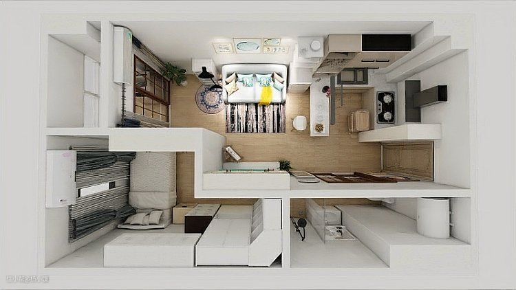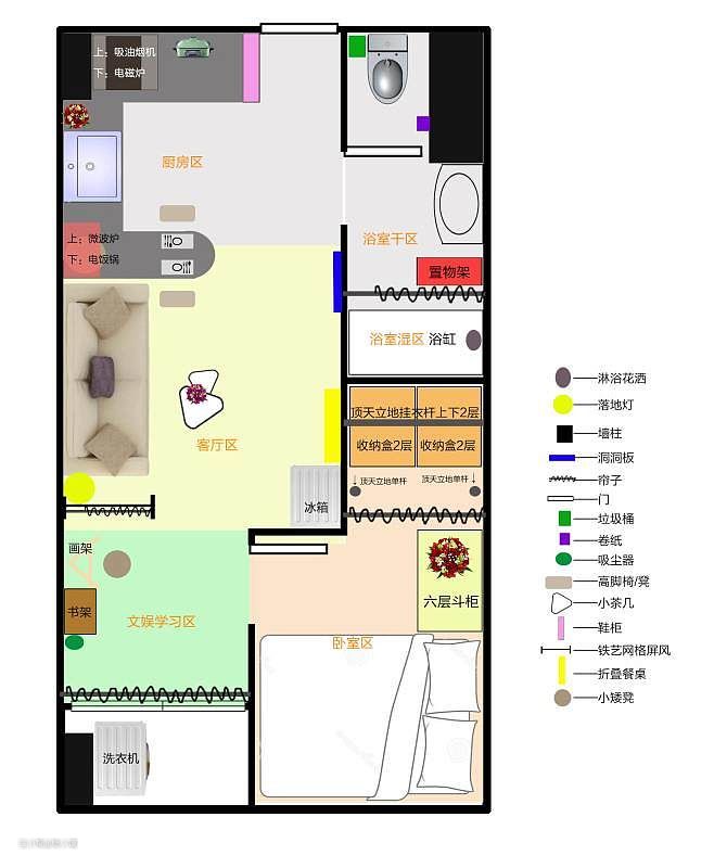 自己用软件设计渲染的俯瞰图。软件用起来不太熟练,而且很多物品找不到理想的样式所以只能尽量找了大概的样子将就着看。有渲染图看起来更直观明了。