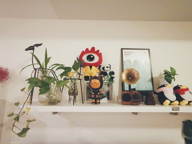 电视背景墙没有过多的设计,加了个搁板放一些小摆件,还有自己DIY的照片挂件。简易教程: