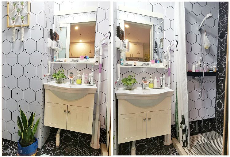 浴室也是自己贴了壁纸和地贴。六边形图案也很经典耐看哒~