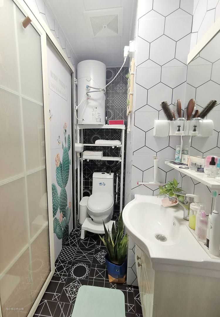 关上门就能看到生机勃勃的仙人掌哈哈哈~~这是卫生间隐藏的小调皮~~和浴帘呼应。 因为马桶上方的空间实在太窄了,只有72cm宽,一般的电热水器都装不了,最开始我买的是A.O.史密斯家的热水器(69.3cm)我还窃喜尺寸刚刚好,殊不知。。。。热水器右侧一定要预留至少30cm的空间,以便后期维修什么的。结果就是,安装不了。。。白白浪费我200块钱改插座位置。这点小伙伴们一定要切记啊!装修前尽可能多的了解一些装修常识,不然白花钱不说,还折腾自己那段时间都没热水洗澡,别提多糟心了! 后来改选了个阿里诗顿可横挂也可立放的热水器总算能安装了。又担心墙体承重问题所以直接打了个不锈钢钢架来放。后期也被我改造成置物架了。可以用来放衣服什么的。