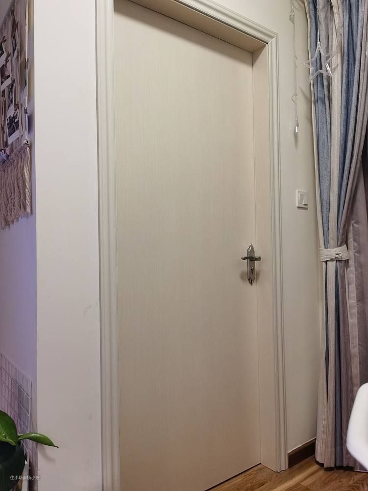 小卧室在沙发右侧对面,阳台旁边。房门是收房自带的,整体乳白色,完全简约风,真的一点造型也没有啊,但是我还蛮喜欢的,简简单单更好看。