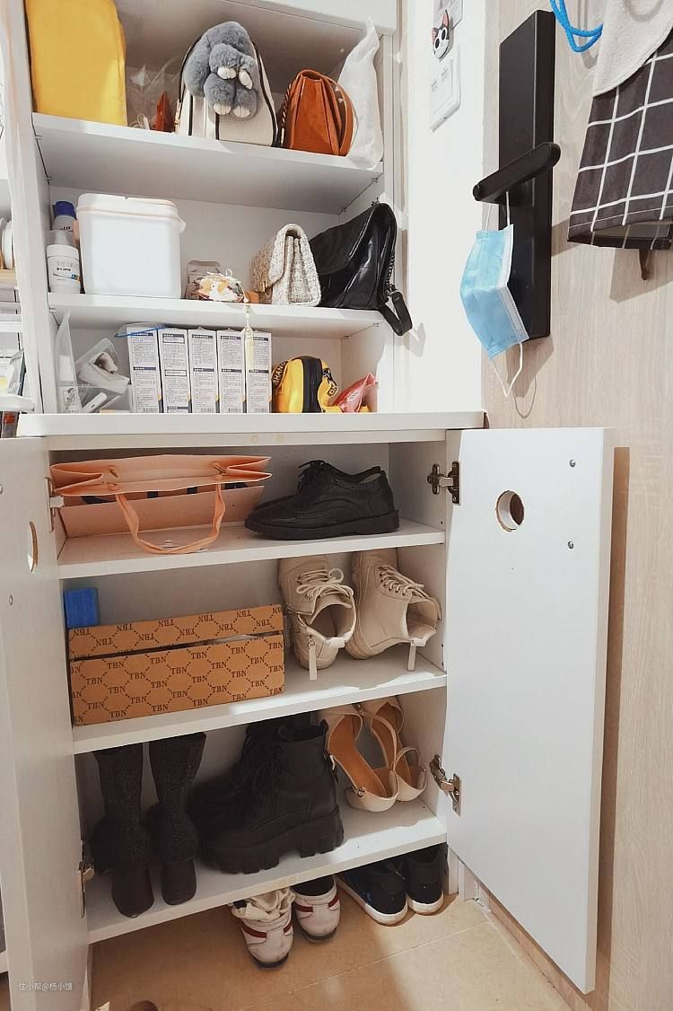下部分的鞋柜是并排着已有的橱柜做的(TIPS:这里是没经验了,鞋柜门应该做成百叶门的,利于通风散味儿),有三层,用来放置常穿的鞋。上面错开玄关柜留出一个台面,可以临时放一下手机以及拿回来的快递等物件,集中在这里消毒再进到家里。最下面留了10cm的空间,可以放拖鞋之类,方便换鞋。 唉说到这里有个小遗憾,因为空间限制,鞋柜只有22cm,柜深不够,有些大一点的鞋子只能侧着放。一定程度降低了柜子的收纳性。😔
