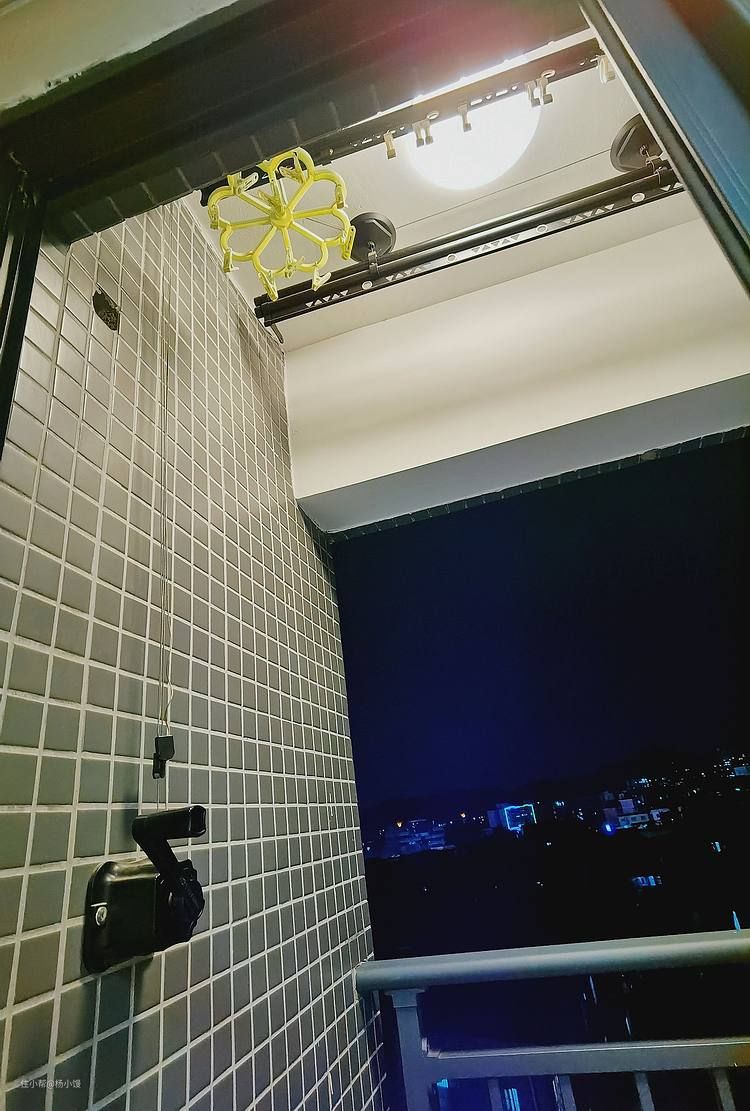 放了洗衣机,放了绿植,就只够站一个人了。(晚上夜景其实还行)