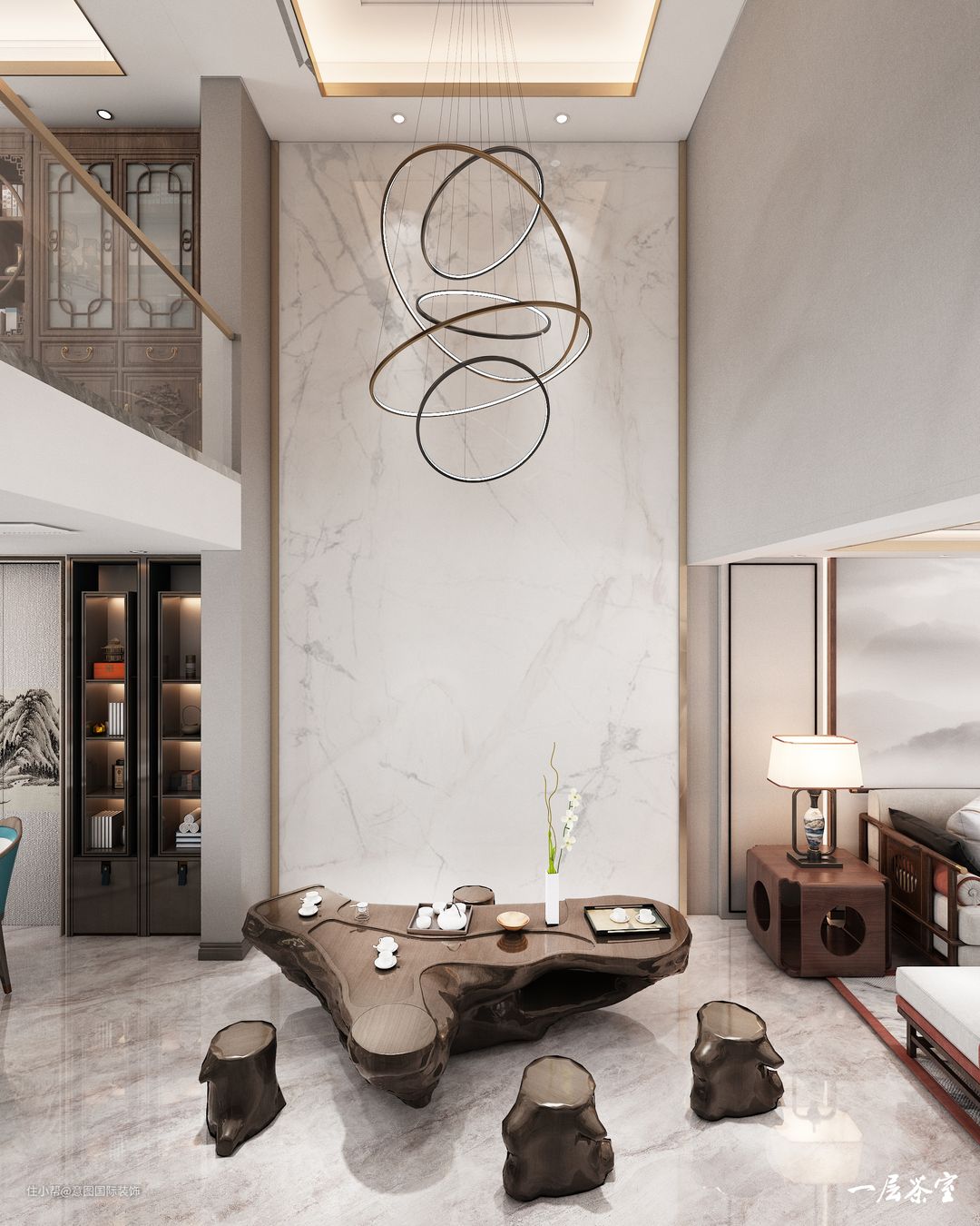 茶室位置高挑空,大气磅礴之感迎面而来,中式讲究留白茶桌的位置便是如此,意境烘托,中式文化淋漓尽致。